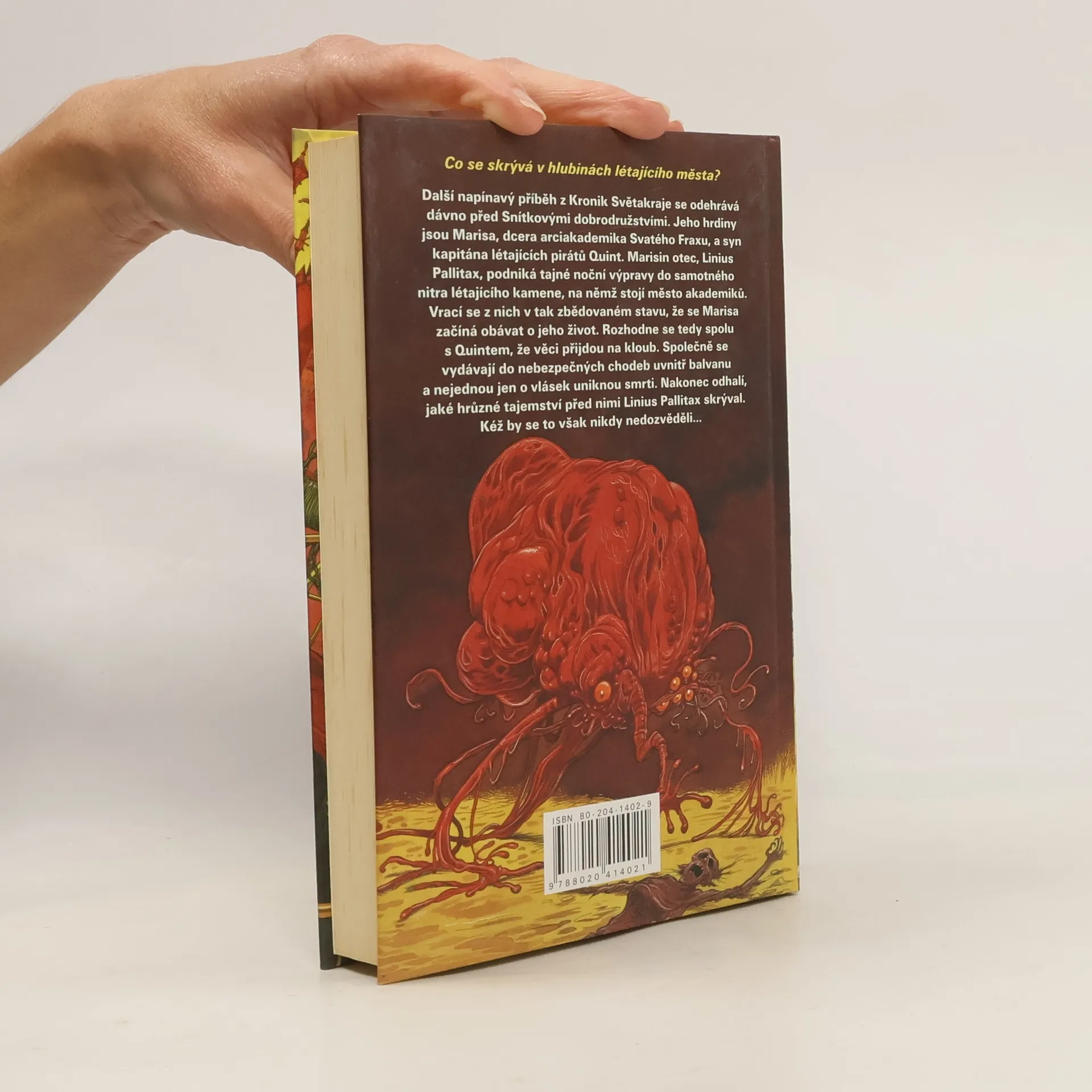 Co se skrývá v hlubinách létajícího města? Další napínavý příběh z Kronik Světakraje se odehrává dávno před Snítkovými dobrodružstvími. Jeho hrdiny jsou Marisa, dcera arciakademika Svatého Fraxu, a syn kapitána létajících pirátů Quint. Marisin otec, Linius Pallitax, podniká tajné noční výpravy do samotného nitra létajícího kamene, na němž stojí město akademiků. Vrací se z nich v tak zbědovaném stavu, že se Marisa začíná obávat o jeho život. Rozhodne se tedy spolu s Quintem, že věci přijdou na kloub. Společně se vydávají do nebezpečných chodeb uvnitř balvanu a nejednou jen o vlásek uniknout smrti. Nakonec odhalí, jaké hrůzné tajemství před nimi Linius Pallitax skrýval. Kéž by se to však nikdy nedozvěděli…
