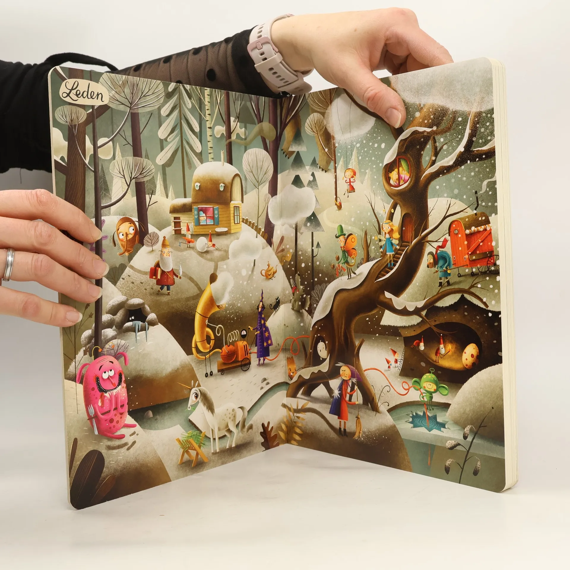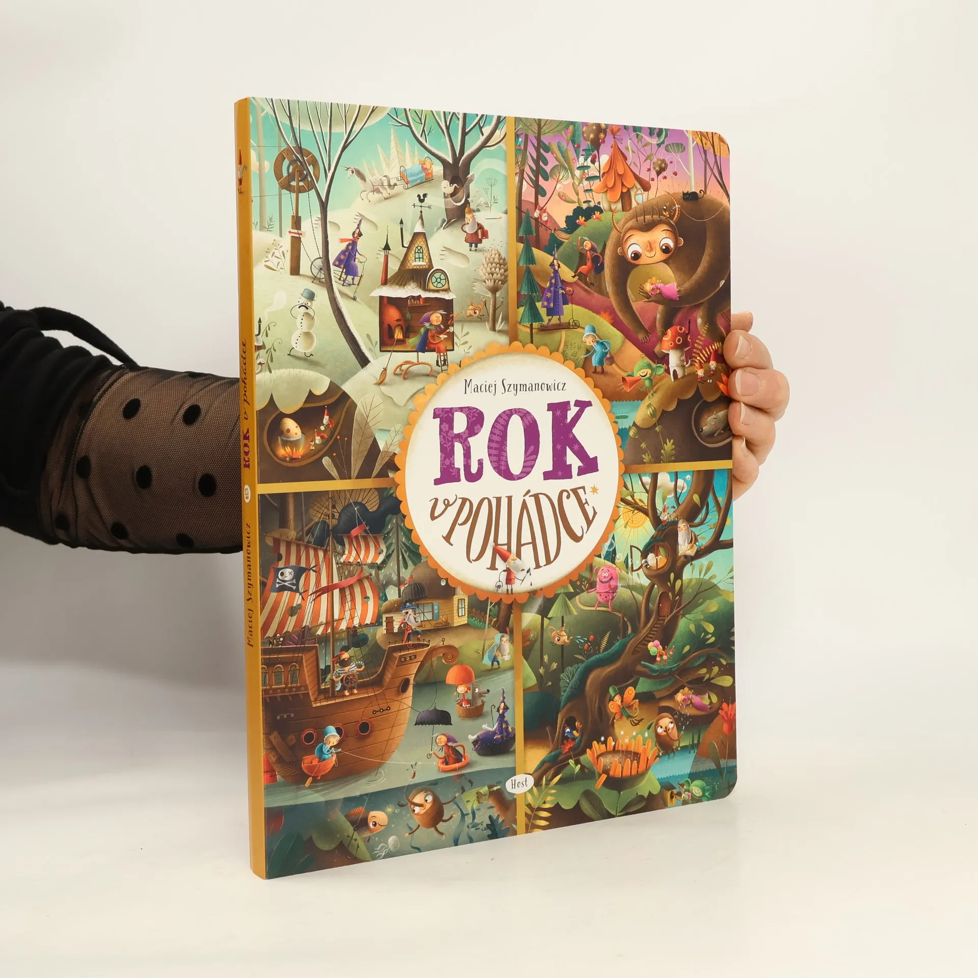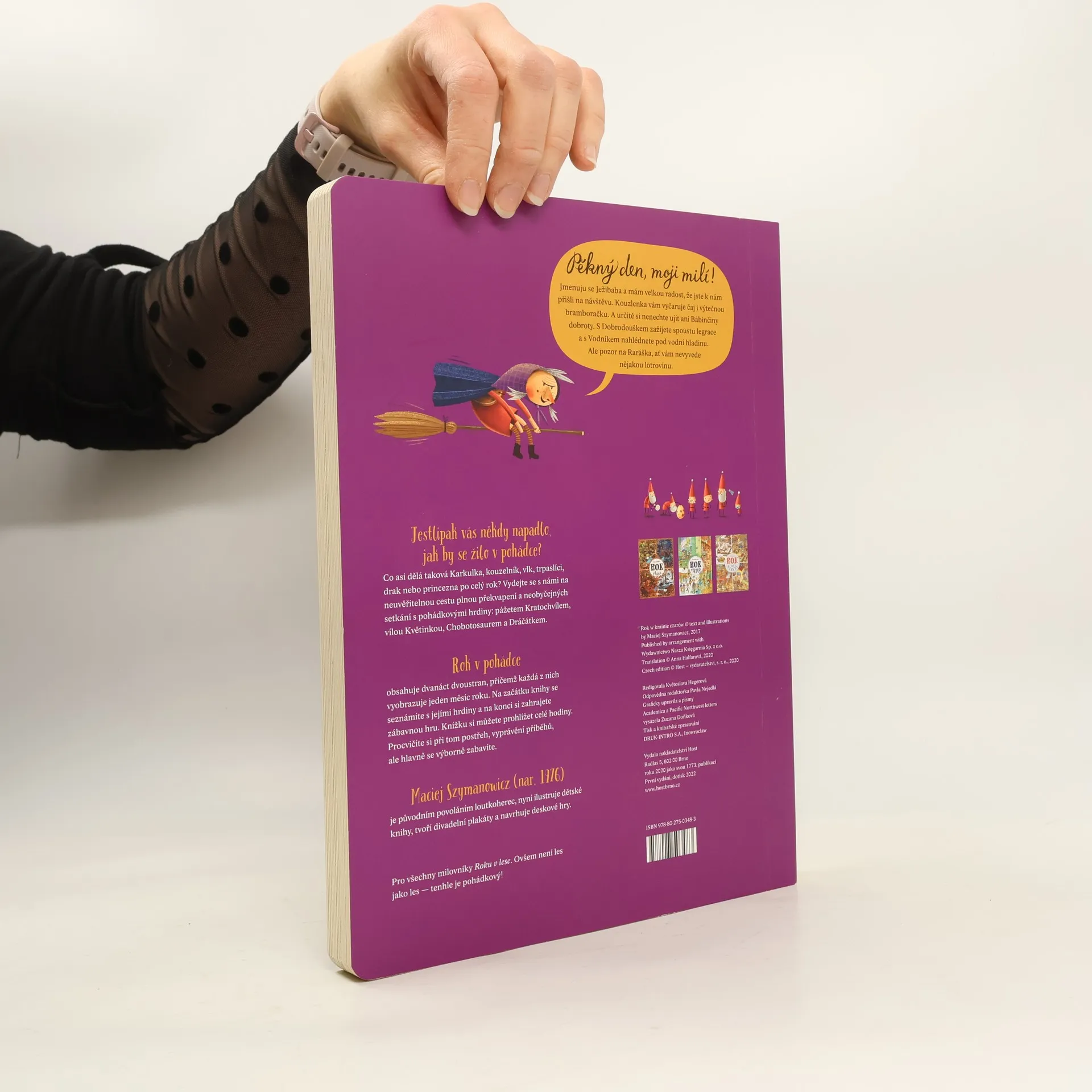 "Pěkný den, moji milí! Jmenuju se Ježibaba a mám velkou radost, že jste k nám přišli na návštěvu. Kouzlenka vám vyčaruje čaj i výtečnou bramboračku. A určitě si nenechte ujít ani Bábinčiny dobroty. S Dobrodouškem zažijete spoustu legrace a s Vodníkem nahlédnete pod vodní hladinu. Ale pozor na Raráška, ať vám nevyvede nějakou lotrovinu. Jestlipak vás někdy napadlo, jak by se žilo v pohádce? Co asi dělá taková Karkulka, kouzelník, vlk, trpaslíci, drak nebo princezna po celý rok? Vydejte se s námi na neuvěřitelnou cestu plnou překvapení a neobyčejných setkání s pohádkovými hrdiny: pážetem Kratochvílem, vílou Květinkou, Chobotosaurem a Dráčátkem. Rok v pohádce obsahuje dvanáct dvoustran, přičemž každá z nich vyobrazuje jeden měsíc roku. Na začátku knihy se seznámíte s jejími hrdiny a na konci si zahrajete zábavnou hru. Knížku si můžete prohlížet celé hodiny. Procvičíte si při tom postřeh, vyprávění příběhů, ale hlavně se výborně zabavíte. Pro všechny milovníky Roku v lese. Protože není les jako les — tenhle je pohádkový! "