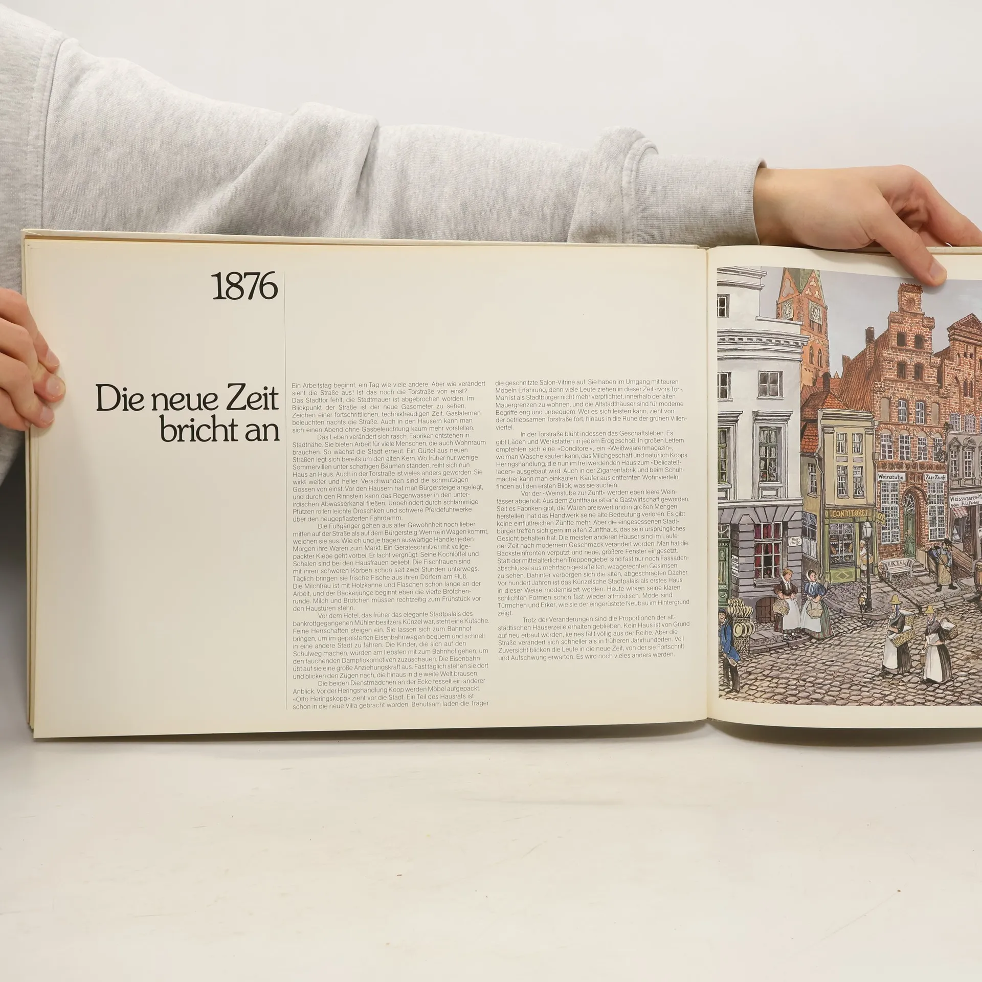 Eine Zeitreise in Bildern. Wie sich unsere Welt in den letzten 800 Jahren verändert hat, können wir am besten an einem ganz alltäglichen Ort nachvollziehen: Die „Torstraße“ ist zwar erdacht, könnte aber in jeder norddeutschen Stadt liegen, und das Leben der Menschen in dieser Straße und die baulichen Veränderungen über die Jahrhunderte sind in diesem Bilderbuch mit Liebe zum Detail und äußerst historischer Genauigkeit dargestellt. Auf vierzehn großformatigen Bildtafeln mit erläuternden Texten wird der Betrachter von Jahrhundert zu Jahrhundert durch die Zeit geführt.