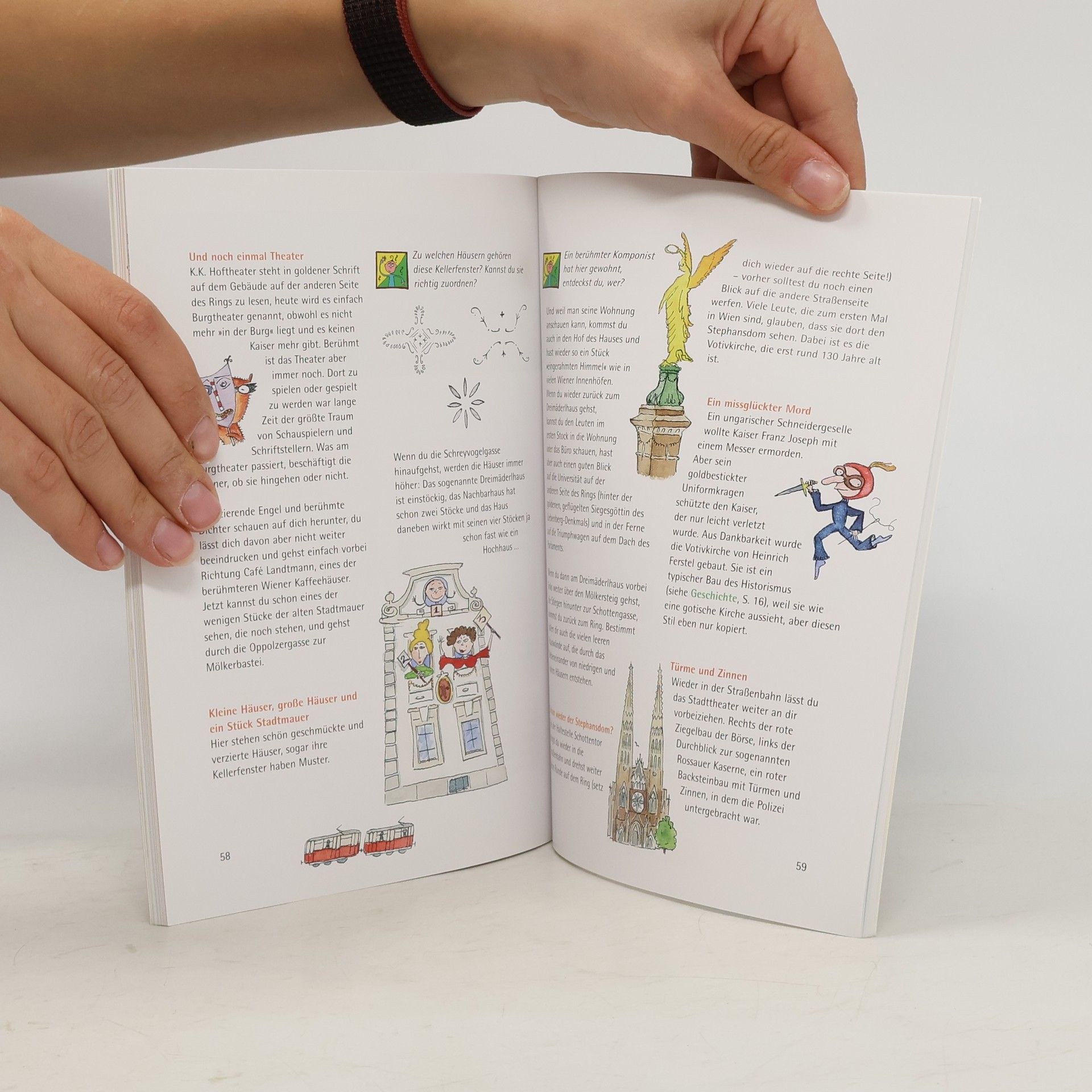 Der neue Wien-Stadtführer für Kinder von Brigitta Höpler und Sibylle Vogel überzeugt durch sein modernes, kindgerechtes Konzept, das ihn für einheimische wie fremde Kinder zum idealen Begleiter durch die Stadt macht. Er führt das Kind – mit oder ohne Begleitung durch Erwachsene – zu Fuß und mit öffentlichen Verkehrsmitteln in sechs Rundgängen durch Wien. Drei Figuren – ein Mädchen und ein Junge im Alter des Zielpublikums sowie ein Hund – führen spielerisch durch das Buch. Jeder Rundgang wird durch einen Übersichtsplan und eine kurze Beschreibung sowie Hinweise auf Verkehrsmittel eingeleitet. Die Schilderung der Sehenswürdigkeiten und des für Kinder Bemerkenswerten erfolgt in kleinen Einheiten, die sich angenehm unterwegs konsumieren lassen und auf das Verständnis und die Interessen von acht- bis zwölfjährigen Kindern zugeschnitten sind. Die Aufmerksamkeit der Leserinnen und Leser wird stimuliert, um ihnen die Möglichkeit zu geben, auch aus eigenem Impuls Entdeckungen zu machen. Kleine Aktivitätsblöcke lockern die Rundgänge zusätzlich auf und vertiefen die Beobachtungen. Die Illustrationen beziehen das Ambiente Wiens erkennbar ein, sind aber vor allem unterhaltend und humorvoll, ohne ins Comicartige abzugleiten. Ein praktischer Teil mit Adressen rundet den Stadtführer ab. Durch seine lesefreundliche Konzeption ist der Wienführer auch als Lektüre für zu Hause geeignet.