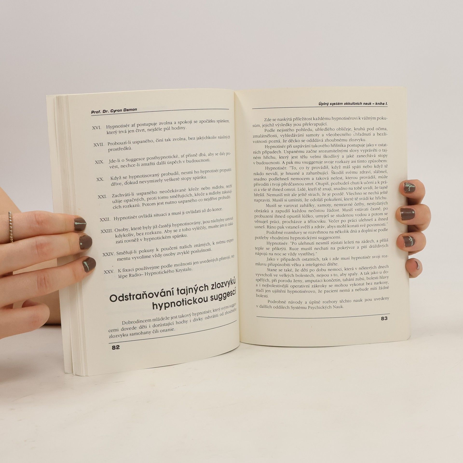 Úplný systém okkultních nauk dle původních přednášek Prof. Dr. Cyrona Damona pro české vydání zpracoval a zredigoval Nakladatel Kodym 1936 KNIHA I. ÚVOD DO PSYCHICKÝCH VĚD A NAUK o hypnotismu, suggesci, telepathii, osobním magnetismu, vývoji, o charakteru a probuzení utajených sil podvědomí KNIHA II. HYPNOTISMUS, telepathie, osobní magnetismus a ovládání lidí okkultními silami