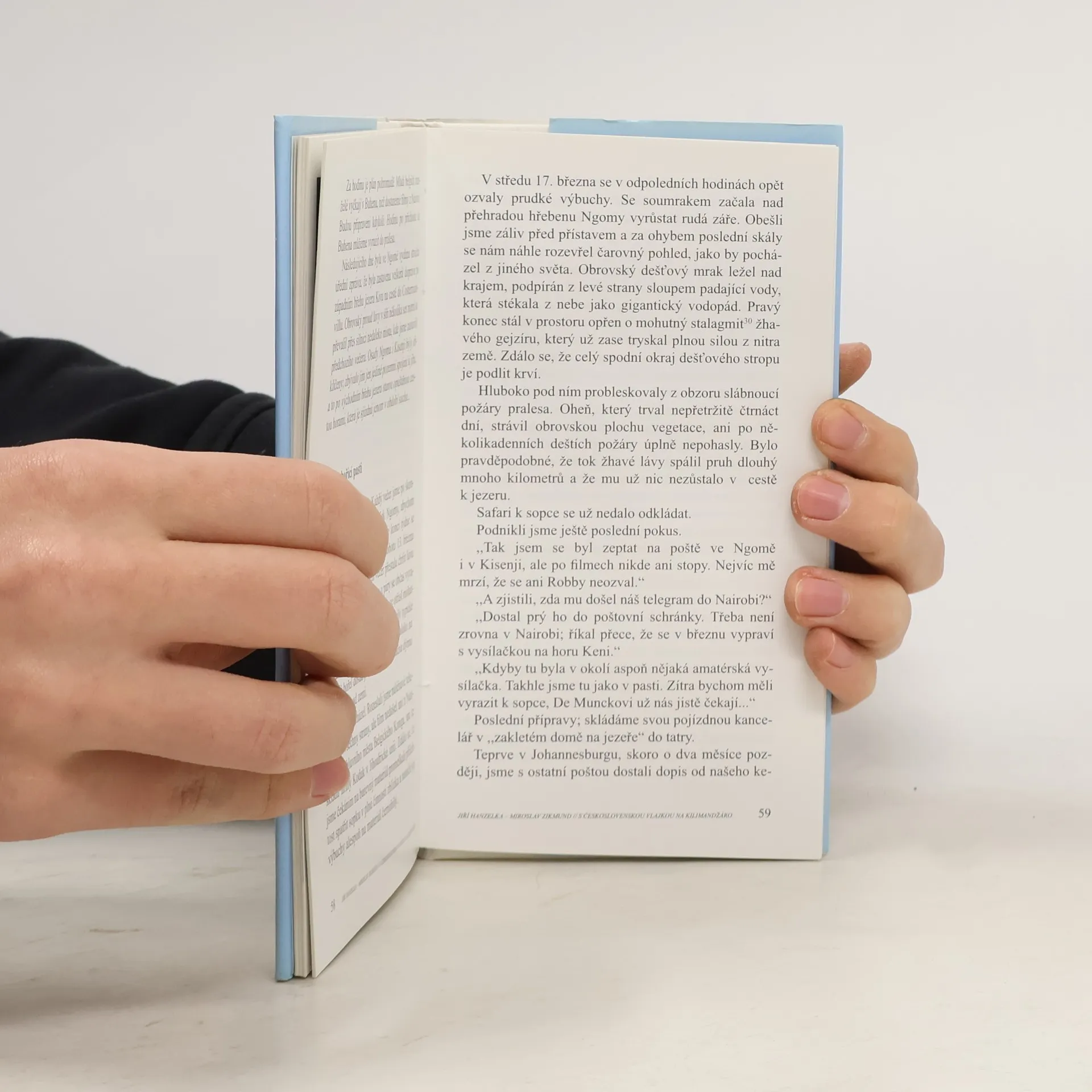 Reedice dvou vybraných kapitol z legendárního cestopisu Afrika snů a skutečnosti. První cestopisná reportáž líčí průjezd rezervací, která se táhne z pohraniční oblasti Tanganjiky (dnes Tanzanie) na úpatí Kilimandžára, k nejvyšší horské skupině na okraji východoafrického příkopu. Pokus o výstup na Kilimandžáro započal v Aruše (Arusha). Osmnáctičlenná karavana vyrazila z Maranga 25.ledna a 28. ledna 1948 zavlála nad Kibem československá vlajka. Druhá reportáž líčí čtrnáctidenní zastávku na březích klidného jezera Kivu začátkem března 1948. Během pobytu v sopečné oblasti na území mezi tehdy Belgickým Kongem a mandátním územím Ruanda Urundi(dnes Rwanda, Zair), zažili cestovatelé zrození nové sopky a nové africké hory. V reportáži zachytili a vyfotografovali zápas a střetnutí dvou živlů - žhavé lávy a vody jezera Kivu. Oba texty doplňují původní fotografie.