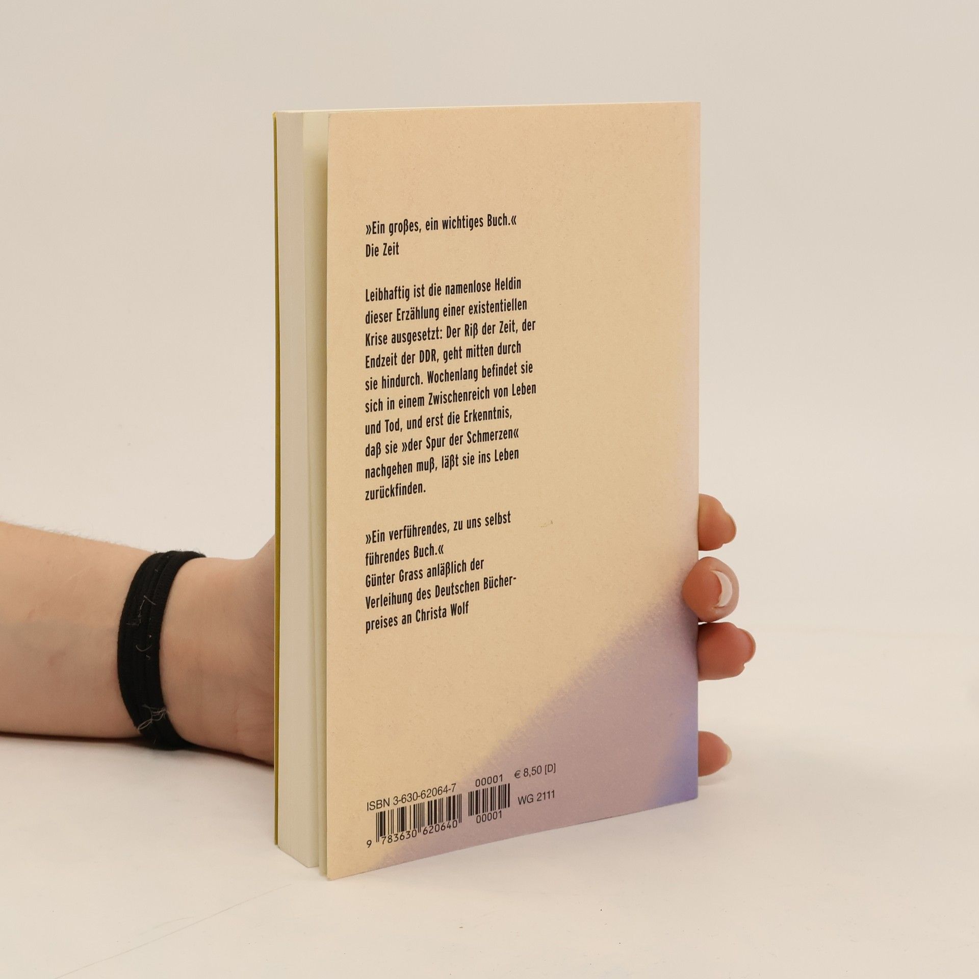 Sechs Jahre nach dem Roman Medea. Stimmen legte Christa Wolf im Frühjahr 2002 wieder eine große Erzählung vor. Wie in ihrem weltweit gefeierten Text Nachdenken über Christa T. geht es auch hier um die lebensbedrohliche Krankheit einer Frau. ‚Leibhaftig‘ ist ihre namenlose Heldin einer existentiellen Krise ausgesetzt: der Riß der Zeit, der Endzeit der DDR, geht mitten durch sie hindurch. Wochenlang befindet sie sich in einem Zwischenreich von Leben und Tod und erst die Erkenntnis, daß sie „der Spur der Schmerzen“, dem Vergessen, nachgehen muß, läßt sie ins Leben zurückfinden.