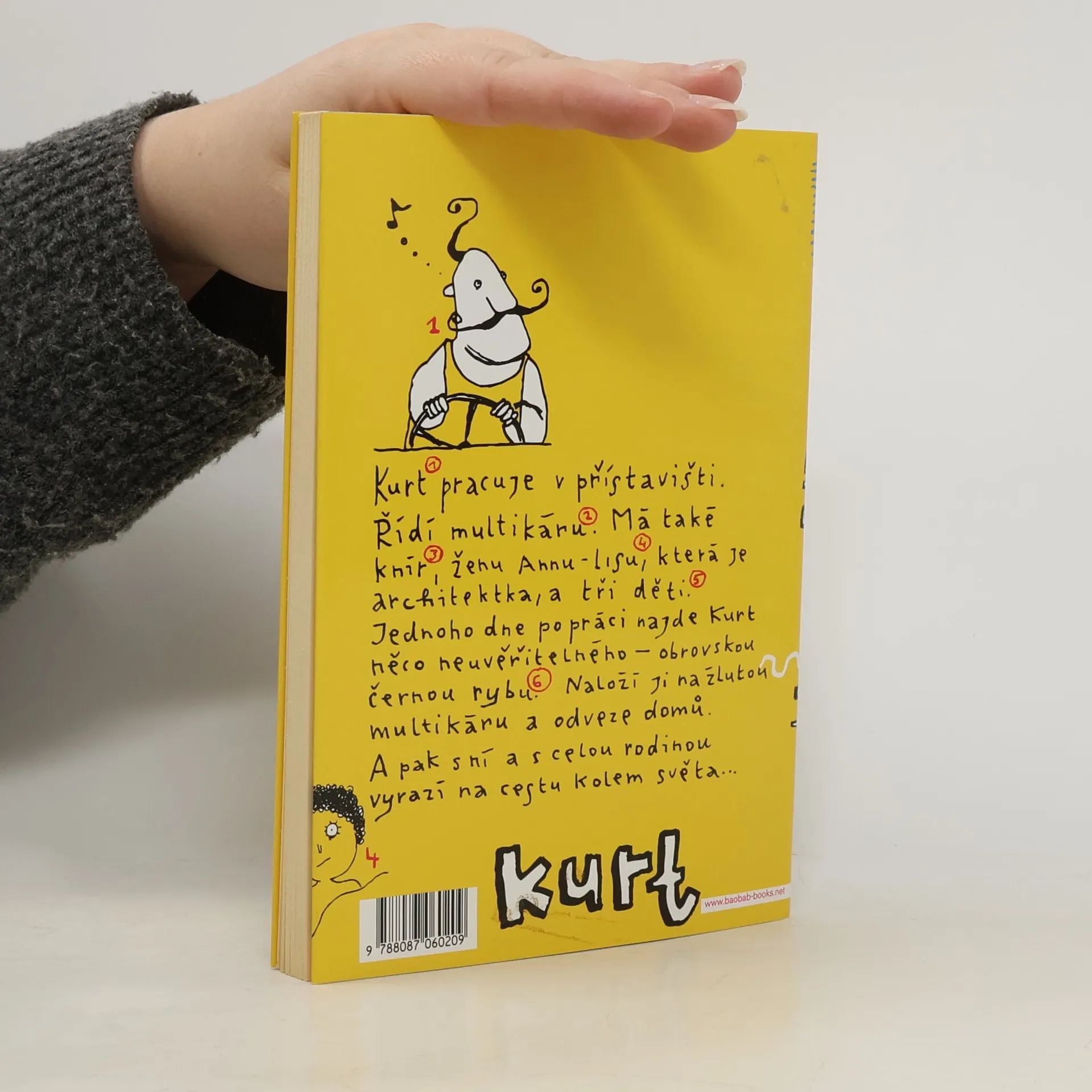 Kurt má knír, multikáru, ženu architektku a tři děti. Jednoho dne po šichtě najde v přístavu velkou černou rybu, která nikomu nepatří, a tak si ji odnese s sebou domů. Jeho rodina tak nečekaně získá dostatek jídla a vyráží s multikárou do světa. Navštíví několik kontinentů a po cestě zažívají neuvěřitelné příhody. Když celou rybu snědí, postaví si její kostru do zahrady jako sochu. Norské i cestovatelské reálie se v knize mísí se zdravou dávkou absurdity, dětským viděním světa a čistou radostí z vyprávění. Kurt je jednoduchý a naivní, ovšem v jeho světě je možné skoro všechno, takže proč se omezovat realitou!