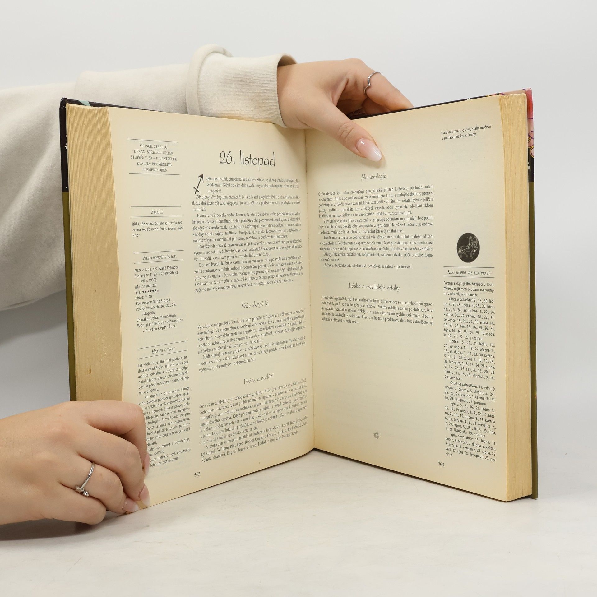 Nevšední publikace - výjimečná rozsahem i provedením - vede k hlubšímu porozumění jedinečného postavení člověka v kosmu. Charakteristiky podle data narození - 366 profilů, pro každý den roku jeden, obsahuje kladné a záporné rysy osobnosti, možnosti kariéry, doporučení v milostných i partnerských vztazích a nejlepší dny pro zamilování a navázání přátelství. Numerologické profily - odhalují význam devíti základníczh čísel a učí, jak si vypočítat své holistické číslo.