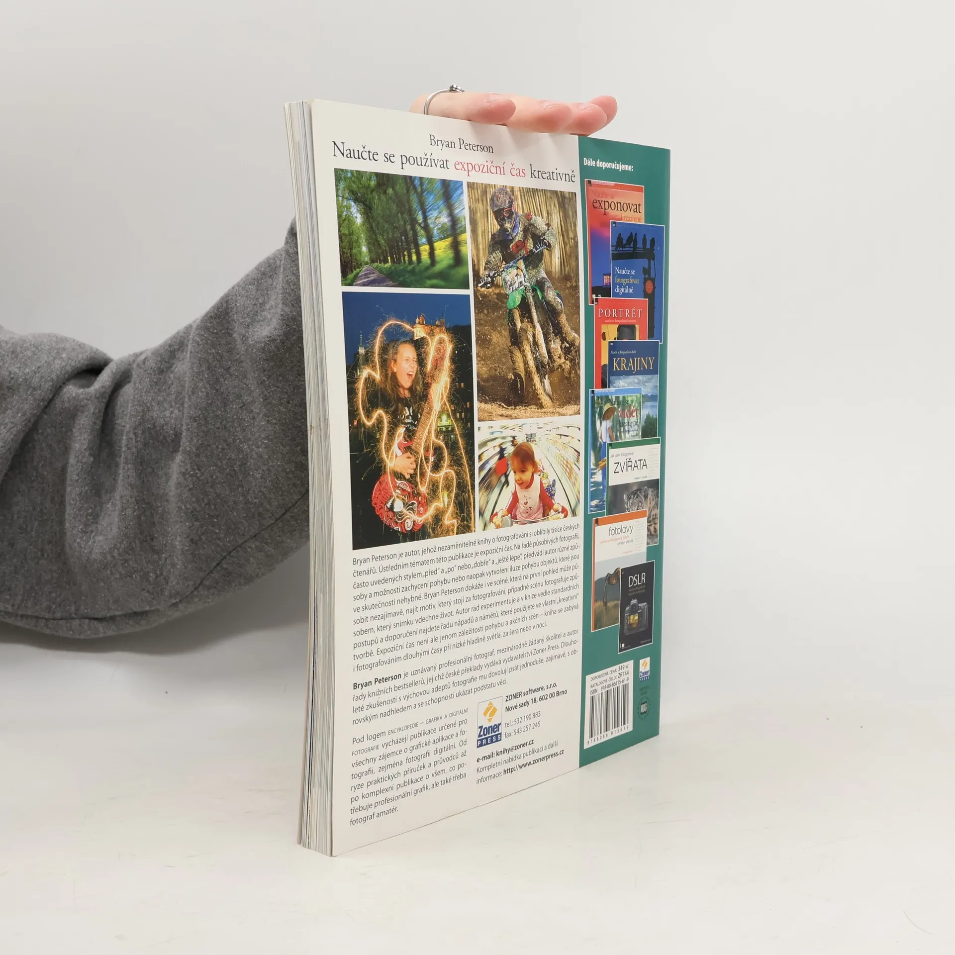 Bryan Peterson je autor, jehož nezaměnitelné knihy o fotografování si oblíbily tisíce českých čtenářů. Ústředním tématem této publikace je expoziční čas. Na řadě působivých fotografií často uvedených stylem 'před' a 'po' nebo 'dobře' a 'ještě lépe' předvádí autor různé způsoby a možnosti zachycení pohybu nebo naopak vytvoření iluze pohybu objektů, které jsou ve skutečnosti nehybné. Bryan Peterson dokáže i ve scéně, která na první pohled může působit nezajímavě, najít motiv, který stojí za fotografování, případně scénu fotografuje způsobem, který snímku vdechne život. Autor rád experimentuje a v knize vedle standardních postupů a doporučení najdete řadu nápadů a námětů, které použijete ve vlastní 'kreativní' tvorbě. Expoziční čas není ale jenom záležitostí pohybu a akčních scén - kniha se zabývá i fotografováním dlouhými časy při nízké hladině světla, za šera nebo v noci.