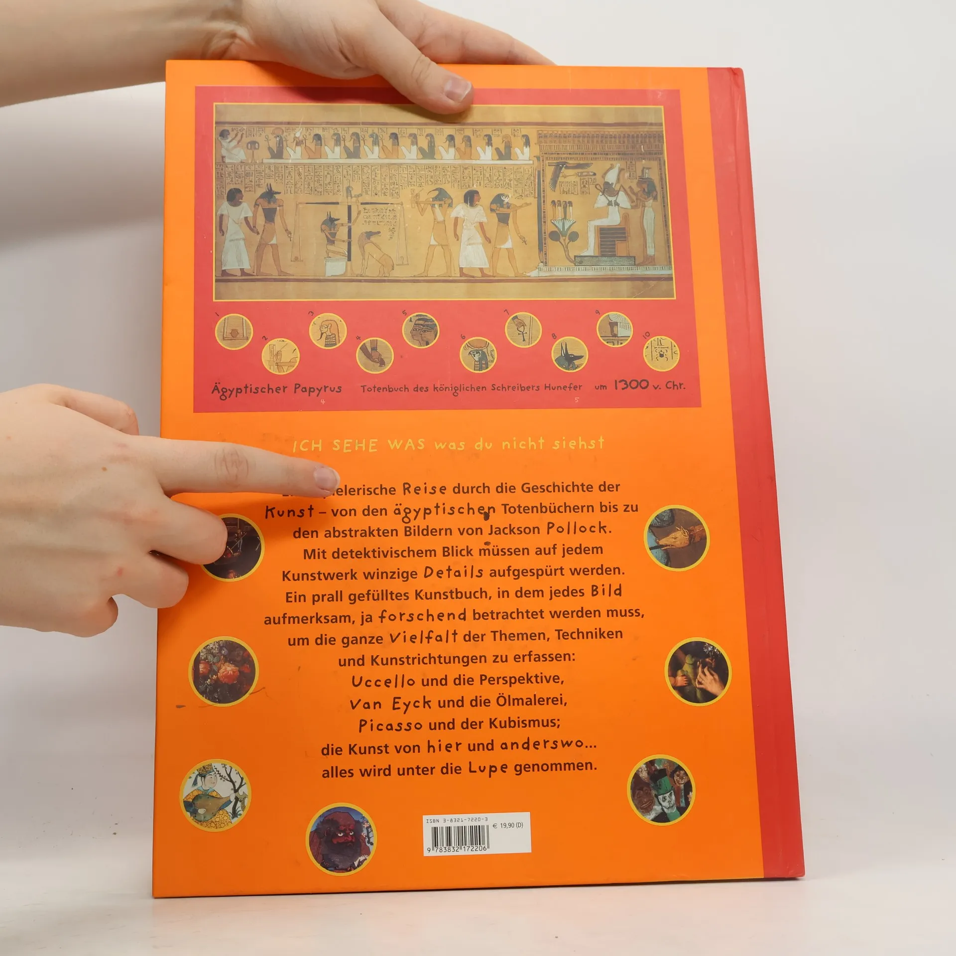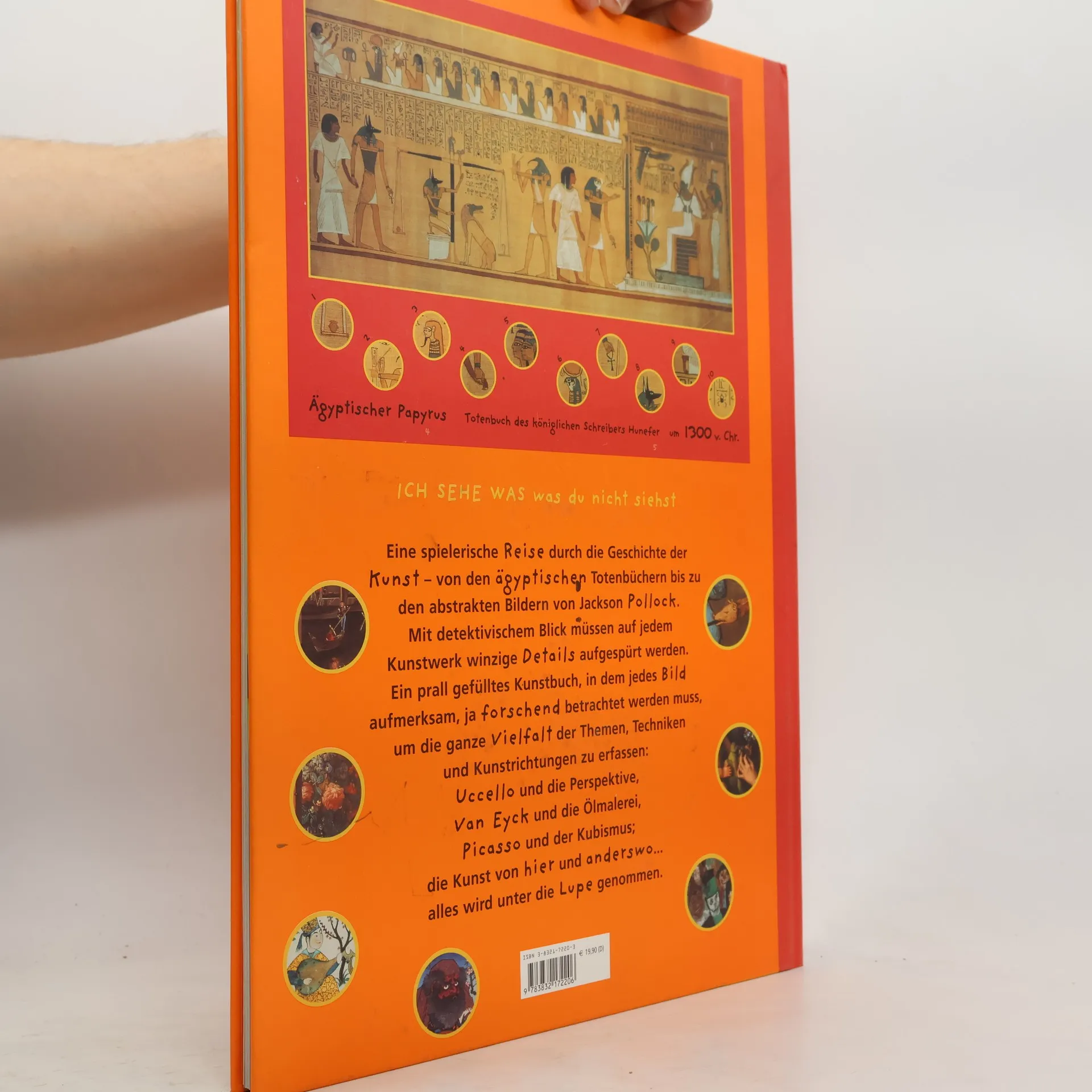 Auf diesem Spaziergang durch die Galerie der Bilder ist alles so, wie Kinder es gern haben: bunt und geheimnisvoll, detailreich und spannend. Da gibt es vieles zu entdecken, und die Freude am Betrachten lenkt Augen und Sinn in andere Welten und andere Zeiten. 23 berühmte Gemälde – so Hieronymus Boschs „Versuchung des Hl. Antonius", die „Hochzeit zu Kanaa" von Paolo Veronese oder Renoirs „Le Moulin de la Galette" – finden sich in diesem wundervollen Geschenkbuch für kleine Betrachter mit großer Phantasie. Schwierige Aufgaben gilt es da zu lösen, denn aus jedem der Bilder sind kleine Ausschnitte „herausgefallen". Und damit sie nicht mehr so rumliegen am Rande der Seite, müssen sie wieder zurück an die richtige Stelle im bunten Treiben: Doch die will erst gefunden werden! So werden kleine Leute spielerisch zur Kunst hingeführt, und der Spaß wird dabei ganz groß geschrieben.Vor allem: Dieses einmalige Buch weist Kindern (und übrigens nicht nur ihnen) den Weg, sich in Bilder zu vertiefen, in sie einzutauchen und sich in ihnen zu verlieren, dabei alles um sich herum zu vergessen. Und vielleicht werden sie sich diese Fähigkeit bewahren, werden sie als Erwachsene Bildern mit gleicher Aufgeschlossenheit und Vorbehaltlosigkeit, mit gleicher Freude gegenübertreten. Kinder sehen die Welt mit ihren Augen