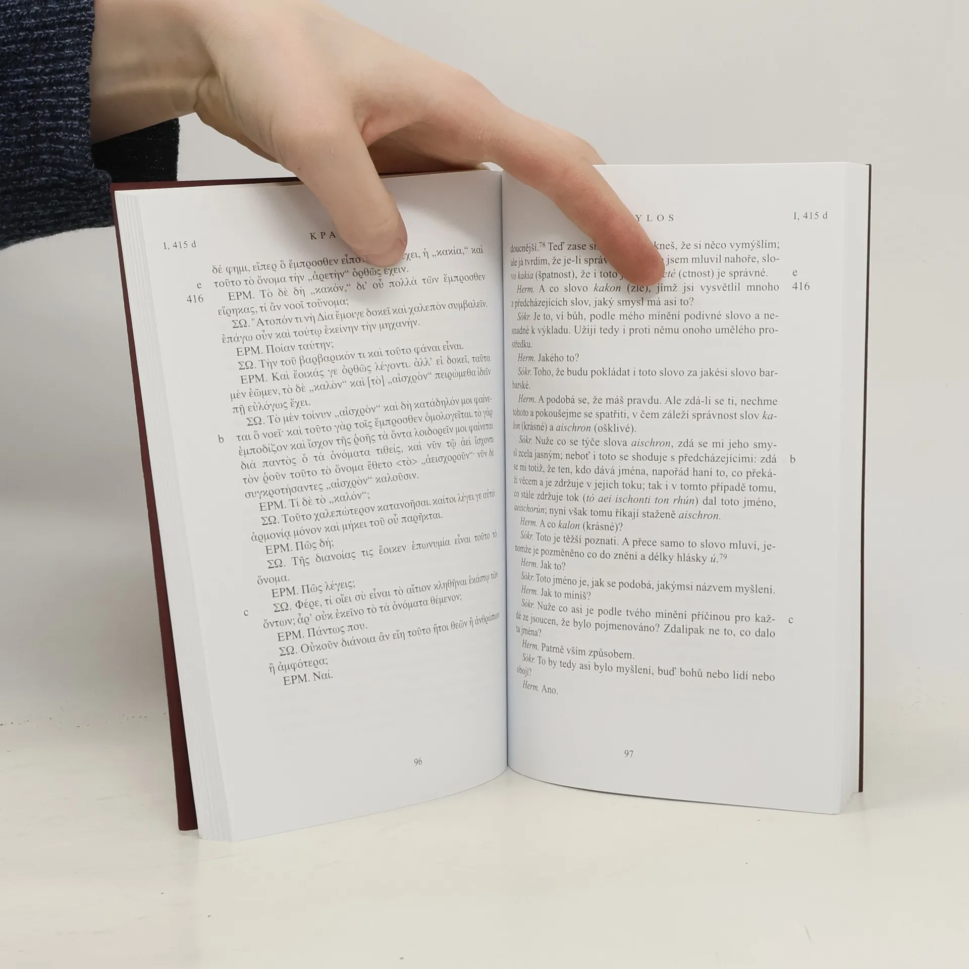 Formou rozhovoru, jehož vůdčí osobností je Sókrates, uvažuje Platón o vztahu věci, pojmu a pojmenování. První svazek řecko-českých vydání Platónových dialogů.