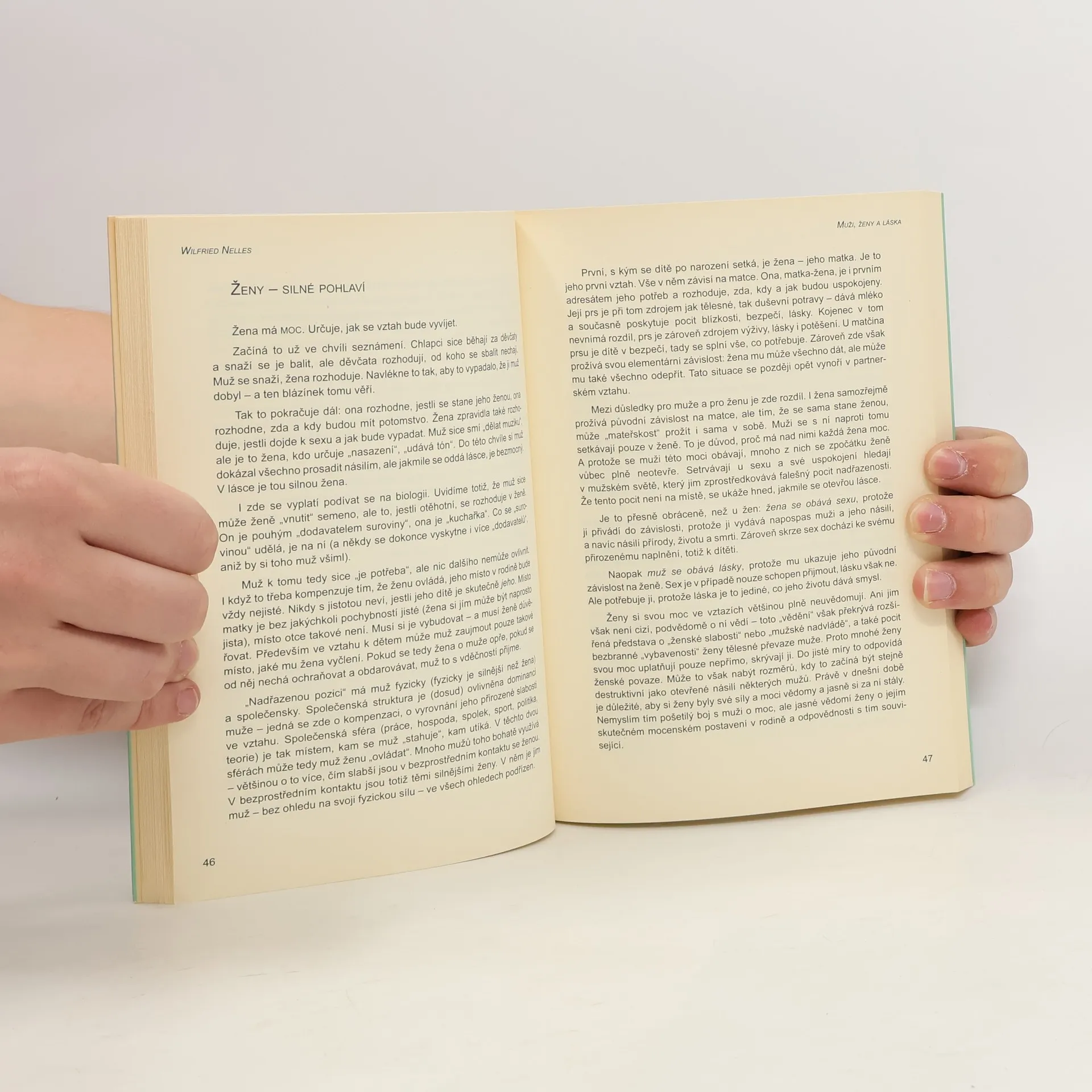 Kniha Wilfrieda Nellese "MUŽI, ŽENY A LÁSKA" u čtenáře vyvolá nejspíš mnoho nečekaných pochopení. Nelles zde propojuje svou dlouholetou zkušenost terapeuta rodinných konstelací s fenomenologickým pozorováním sexuality. Oceňuje význam sexuality coby prapůvodní síly veškerého života, kterávšak podle něj může přežít jedině tehdy, když je propojena s láskou. Láska samotná však má budoucnost pouze v případě, jestliže "vyroste" z převládajících dětských a pubertálních představ a dospěje. "U lásky nejde primárně o to,být milován'. To si přejí děti, a kdo jako dospělý dává prioritu tomuto přání, zůstává dítětem. Samozřejmě, že každý by chtěl být i milován, toto přání tu je a je naprosto v pořádku. Ale nesmí stát na prvním místě, protože pokud chceme lásku tímto způsobem dostat, mineme se s ní. Jde o to,milovat'. Láska vzniká, když milujeme."