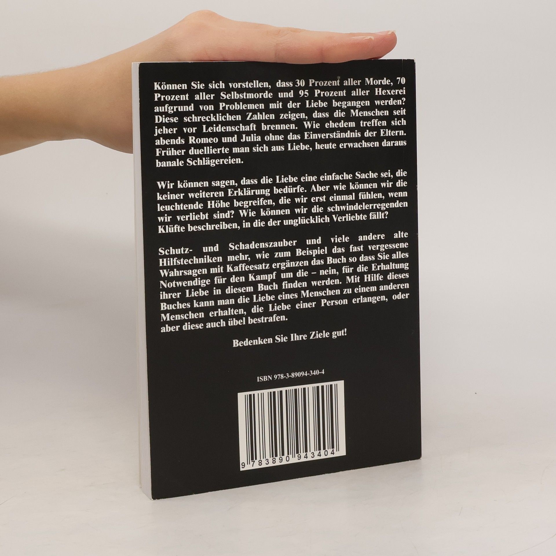 Können Sie sich vorstellen, dass 30 Prozent aller Morde, 70 Prozent aller Selbstmorde und 95 Prozent aller Hexerei aufgrund von Problemen mit der Liebe begangen werden? Diese schrecklichen Zahlen zeigen, dass die Menschen seit jeher vor Leidenschaft brennen. Wie ehedem treffen sich abends Romeo und Julia ohne das Einverständnis ihrer Eltern. Früher duellierte man sich aus Liebe, heute erwachsen daraus banale Schlägereien. Wir können sagen, dass die Liebe eine einfache Sache sei, die keiner weiteren Erklärung bedürfe. Aber wie können wir die leuchtende Höhe begreifen, die wir erst einmal fühlen, wenn wir verliebt sind? Wie können wir die Schwindelerregenden Klüfte beschreiben, in die der unglücklich Verliebte fällt? Schutz- und Schadenszauber und viele andere alte Hilfstechniken mehr, wie zum Beispiel das fast vergessene Wahrsagen mit Kaffeesatz ergänzen das Buch so, dass Sie alles Notwendige für den Kampf um die - nein, für die Erhaltung ihrer Liebe in diesem Buch finden werden. Mit Hilfe dieses Buches kann man die Liebe eines Menschen zu einem anderen Menschen erhalten, die Liebe einer Person erlangen, oder aber diese auch übel bestrafen. Bedenken Sie Ihre Ziele gut!