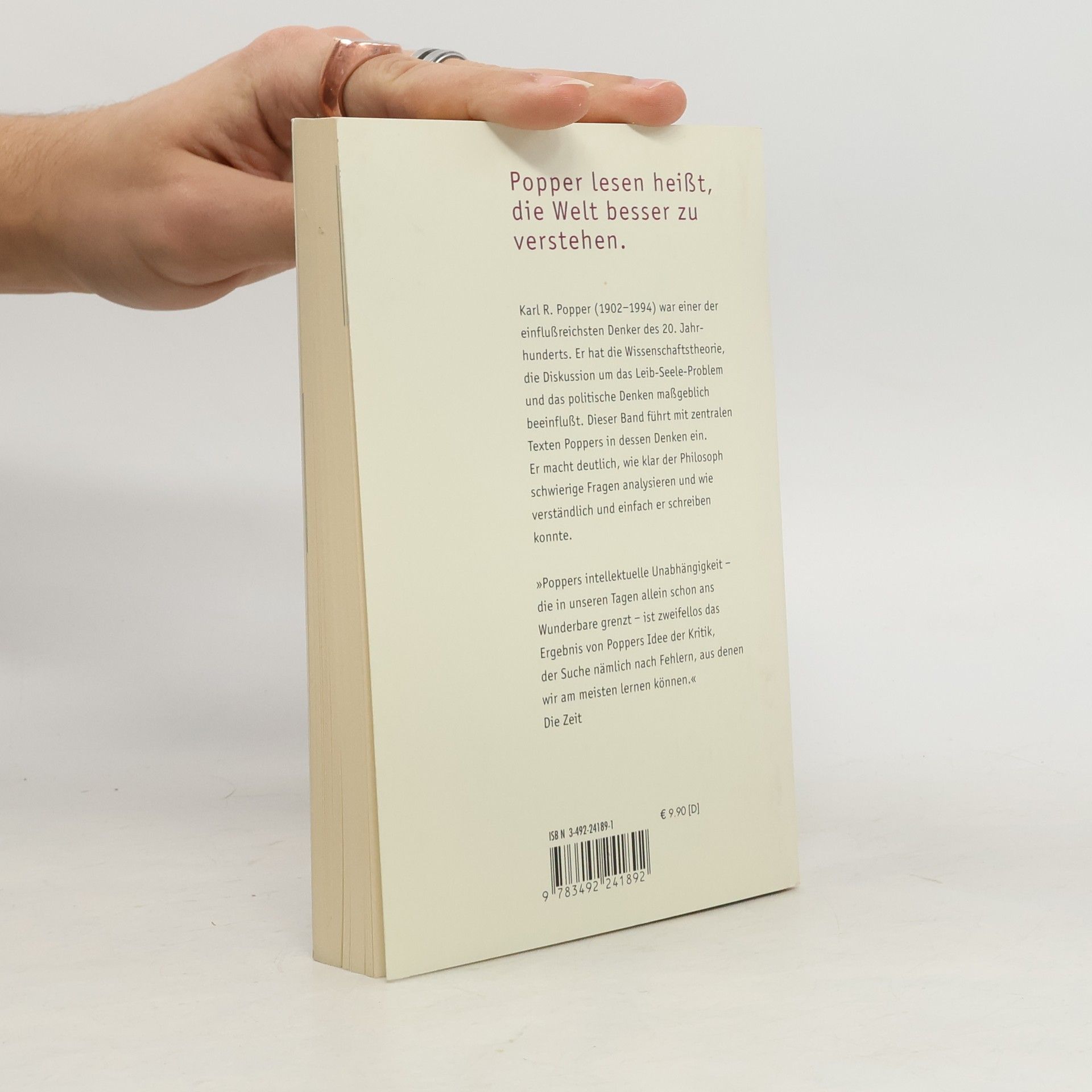 Karl R. Popper (1902 – 1994) war einer der einflußreichsten Denker des 20. Jahrhunderts. Er hat die Wissenschaftstheorie, die Diskussion um das Leib-Seele-Problem und das politische Denken maßgeblich beeinflußt. Dieser Band führt mit zentralen Texten Poppers in dessen Denken ein. Er macht deutlich, wie klar der Philosoph schwierige Fragen analysieren und wie verständlich und einfach er schreiben konnte. »Poppers intellektuelle Unabhängigkeit – die in unseren Tagen allein schon ans Wunderbare grenzt – ist zweifellos das Ergebnis von Poppers Idee der Kritik, der Suche nämlich nach Fehlern, aus denen wir am meisten lernen können.« Die Zeit