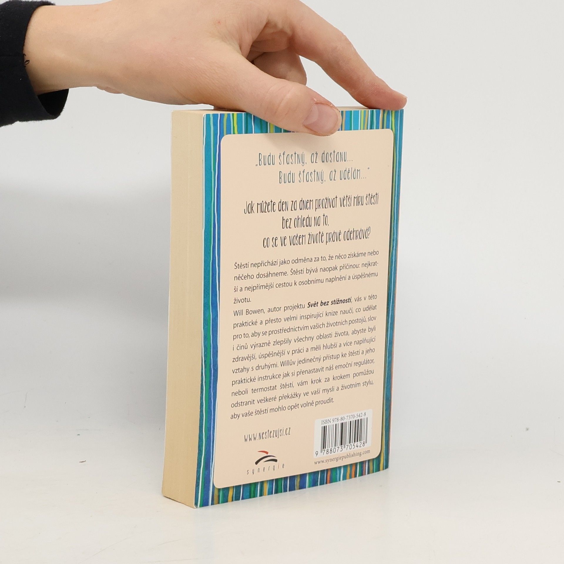 Jak můžete den za dnem prožívat větší míru štěstí bez ohledu na to, co se ve vašem životě právě odehrává? Štěstí nepřichází jako odměna za to, že něco získáme nebo něčeho dosáhneme. Štěstí bývá naopak příčinou: nejkratší a nejpřímější cestou k osobnímu naplnění a úspěšnému životu. Will Bowen, autor projektu Svět bez stížností, vás v této praktické a přesto velmi inspirující knize naučí, co udělat pro to, aby se prostřednictvím vašich životních postojů, slov i činů výrazně zlepšily všechny oblasti života, abyste byli zdravější, úspěšnější v práci a měli hlubší a více naplňující vztahy s druhými. Willův jedinečný přístup ke štěstí a jeho praktické instrukce jak si přenastavit náš emoční regulátor, neboli termostat štěstí, vám krok za krokem pomůžou odstranit veškeré překážky ve vaší mysli a životním stylu, aby vaše štěstí mohlo opět volně proudit.