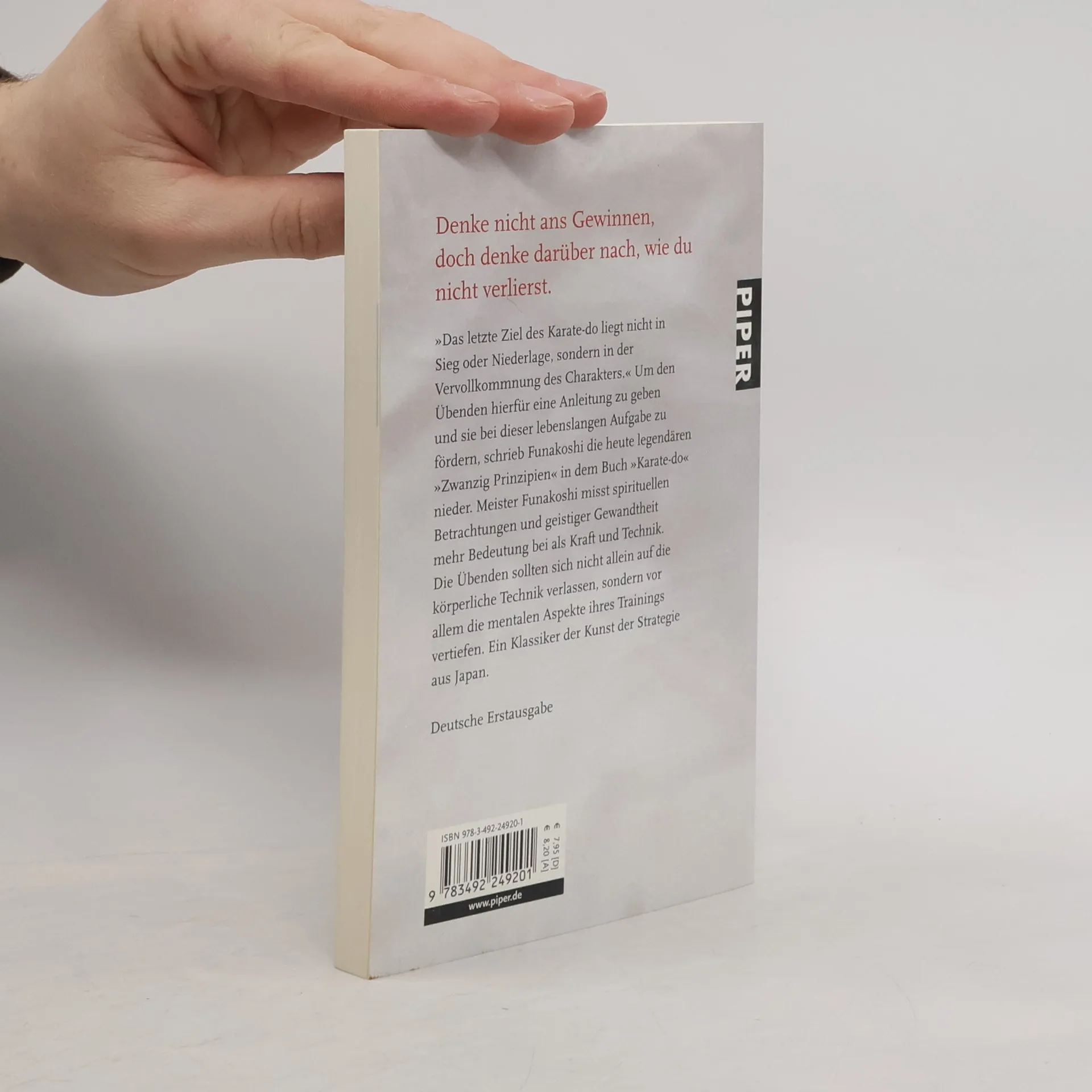 'Das letzte Ziel des Karate-do liegt nicht in Sieg oder Niederlage, sondern in der Vervollkommnung des Charakters.' Um den Übenden hierfür eine Anleitung zu geben und sie bei dieser lebenslangen Aufgabe zu fördern, schrieb Funakoshi die heute legendären 'Zwanzig Prinzipien' in dem Buch 'Karate-do' nieder. Meister Funakoshi misst spirituellen Betrachtungen und geistiger Gewandtheit mehr Bedeutung bei als Kraft und Technik. Die Übenden sollten sich nicht allein auf die körperliche Technik verlassen, sondern vor allem die mentalen Aspekte ihres Trainings vertiefen. Ein Klassiker der Kunst der Strategie aus Japan.