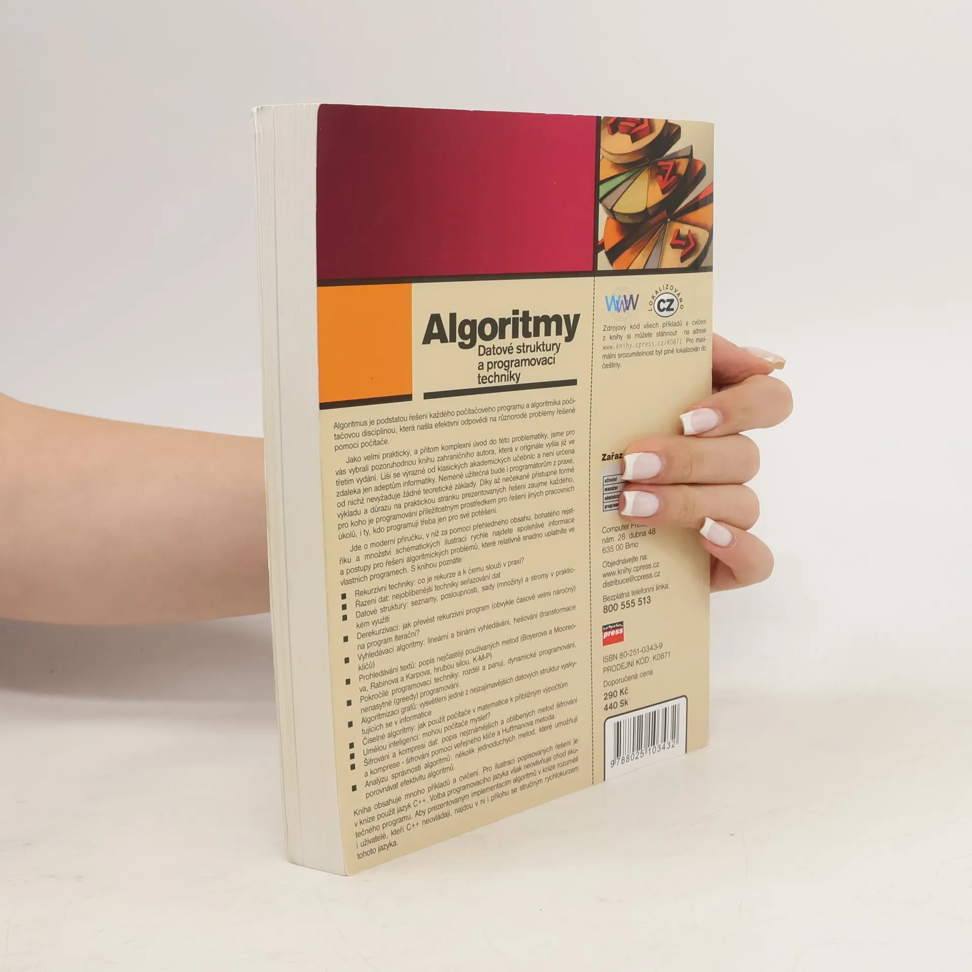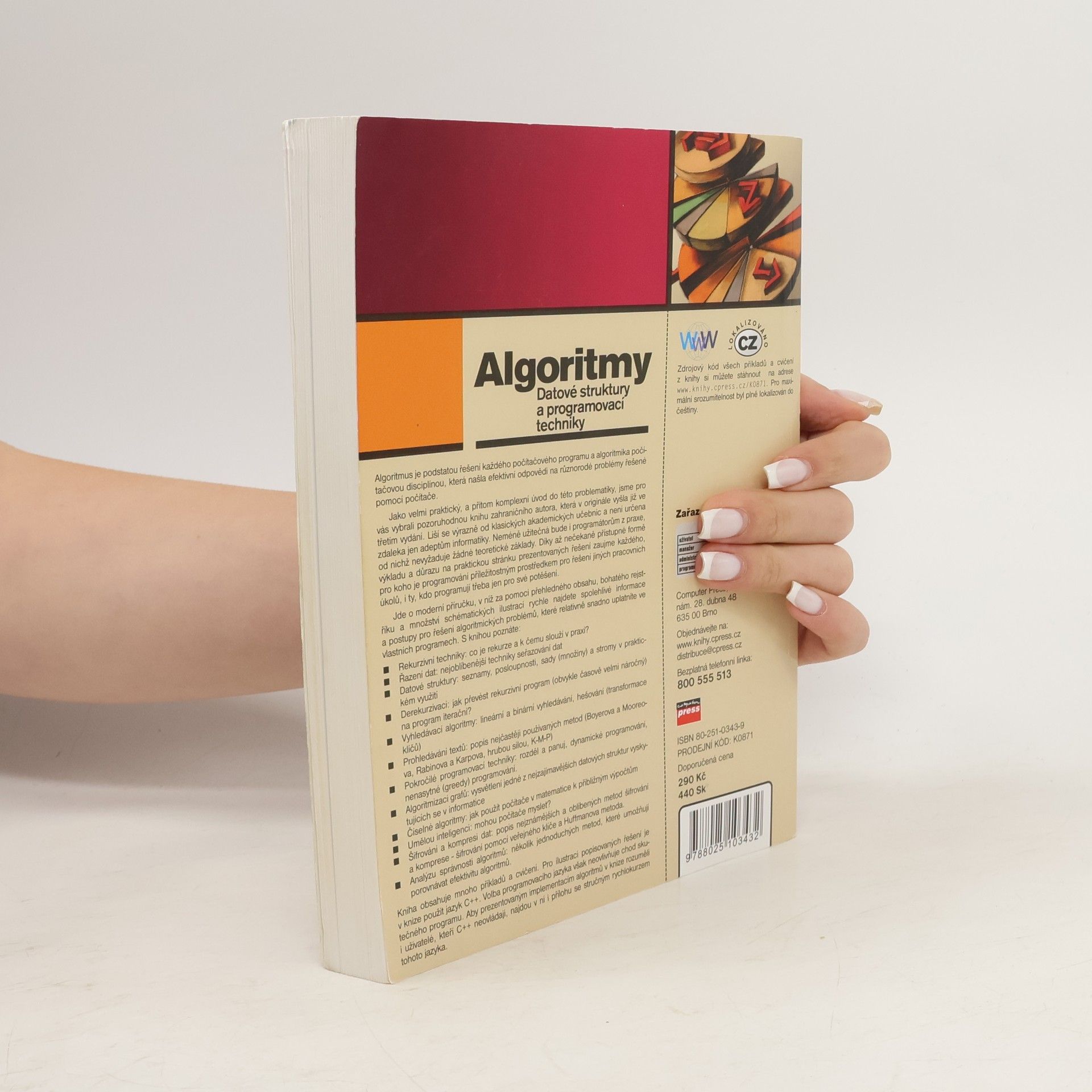 Algoritmus je podstatou řešení každého počítačového programu a algoritmika počítačovou disciplínou, která našla efektivní odpovědi na různorodé problémy řešené pomocí počítače. Jako velmi praktický, a přitom komplexní úvod do této problematiky, jsme pro vás vybrali pozoruhodnou knihu zahraničního autora, která v originále vyšla již ve třetím vydání. Liší se výrazně od klasických akademických učebnic a není určena zdaleka jen adeptům informatiky. Neméně užitečná bude i programátorům z praxe, od nichž nevyžaduje žádné teoretické základy. Díky až nečekaně přístupné formě výkladu a důrazu na praktickou stránku prezentovaných řešení zaujme každého, pro koho je programování příležitostným prostředkem pro řešení jiných pracovních úkolů, i ty, kdo programují třeba jen pro své potěšení. Jde o moderní příručku, v níž za pomoci přehledného obsahu, bohatého rejstříku a množství schématických ilustrací rychle najdete spolehlivé informace a postupy pro řešení algoritmických problémů, které relativně snadno uplatníte ve vlastních programech. S knihou poznáte: Rekurzivní techniky: co je rekurze a k čemu slouží v praxi? Řazení dat: nejoblíbenější techniky seřazování dat Datové struktury: seznamy, posloupnosti, sady (množiny) a stromy v praktickém využití Derekurzivaci: jak převést rekurzivní program (obvykle časově velmi náročný) na program iterační? Vyhledávací algoritmy: lineární a binární vyhledávání, hešování (transformace klíčů) Prohledávání textů: popis nejčastěji používaných metod (Boyerova a Mooreova, Rabinova a Karpova, hrubou silou, K-M-P) Pokročilé programovací techniky: rozděl a panuj, dynamické programování, nenasytné (greedy) programování. Algoritmizaci grafů: vysvětlení jedné z nejzajímavějších datových struktur vyskytujících se v informatice Číselné algoritmy: jak použít počítače v matematice k přibližným výpočtům Umělou inteligenci: mohou počítače myslet? Šifrování a kompresi dat: popis nejznámějších a oblíbených metod šifrování a komprese - šifrování pomocí veřejného klíče a Huffmanova metoda. Analýzu správnosti algoritmů: několik jednoduchých metod, které umožňují porovnávat efektivitu algoritmů. Kniha obsahuje mnoho příkladů a cvičení. Pro ilustraci popisovaných řešení je v knize použit jazyk C++. Volba programovacího jazyka však neovlivňuje chod skutečného programu. Aby prezentovaným implementacím algoritmů v knize rozuměli i uživatelé, kteří C++ neovládají, najdou v ní i přílohu se stručným rychlokurzem tohoto jazyka.