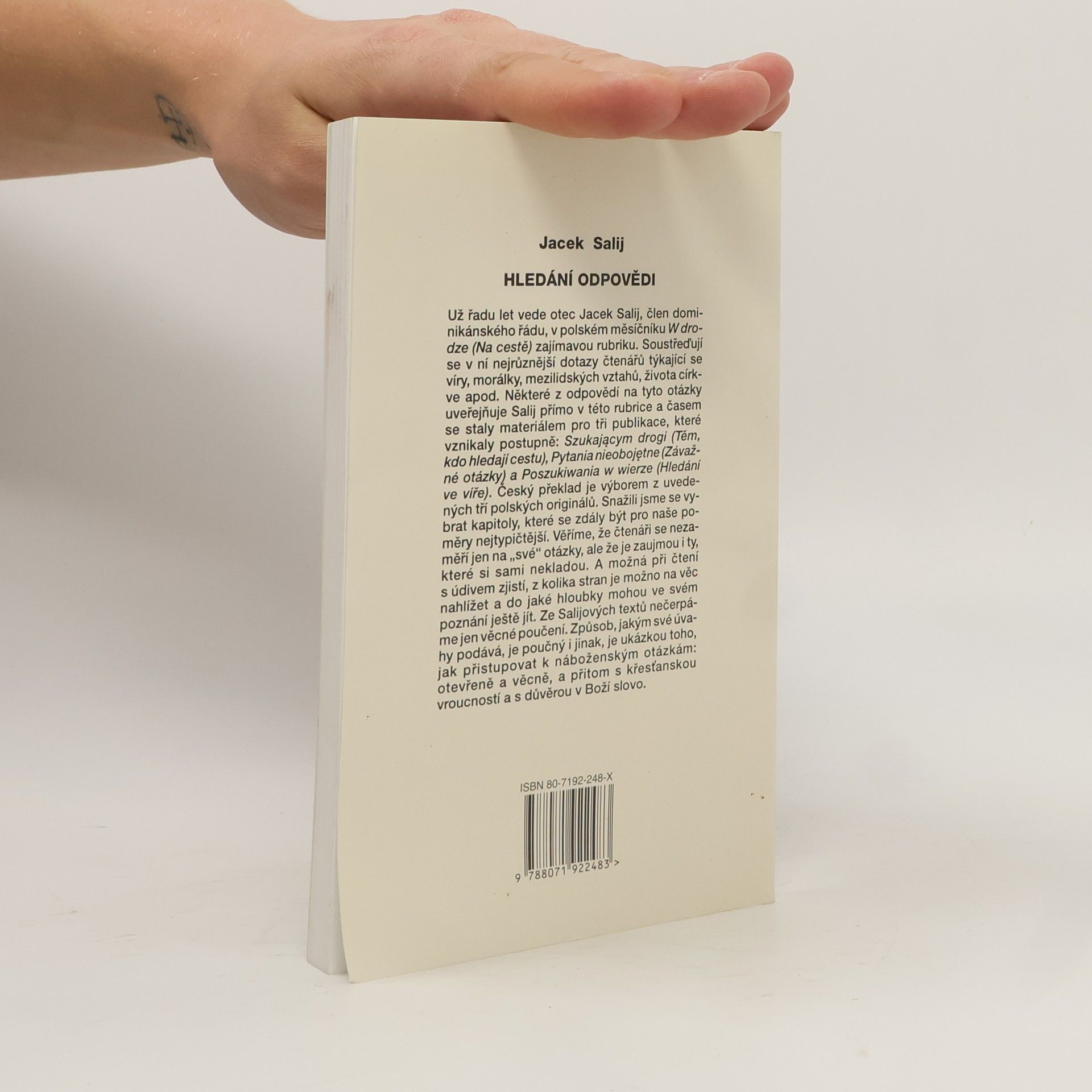 Už řadu let vede otec Jacek Salij, člen dominikánského řádu, v polském měsíčníku W drodze (Na cestě) zajímavou rubriku. Soustřeďují se v ní nejrůznější dotazy čtenářů, týkající se víry, morálky, mezilidských vztahů, života církve apod. Některé z odpovědí na tyto otázky uveřejňuje Salij přímo v této rubrice a časem se staly materiálem pro tři publikace, které vznikaly postupně: (Těm, kdo hledají cestu), (Závažné otázky) a (Hledání ve víře), Český překlad je výborem z uvedených tří polských originálů. Snažili jsme se vybrat kapitoly, které se zdály být pro naše poměry nejtypičtější. Věříme, že čtenáři se nezaměří jen na "své" otázky, ale že je zaujmou i ty, které si sami nekladou. A možná při čtení s údivem zjistí, z kolika stran je možno na věc nahlížet a do jaké hloubky mohou ve svém poznání ještě jít. Ze Salijových textů nečerpáme jen věcné poučení. Způsob, jakým své úvahy podává, je poučný i jinak, je ukázkou toho, jak přistupovat k náboženským otázkám: otevřeně a věcně, a přitom s křesťanskou vroucností a s důvěrou v Boží slovo.