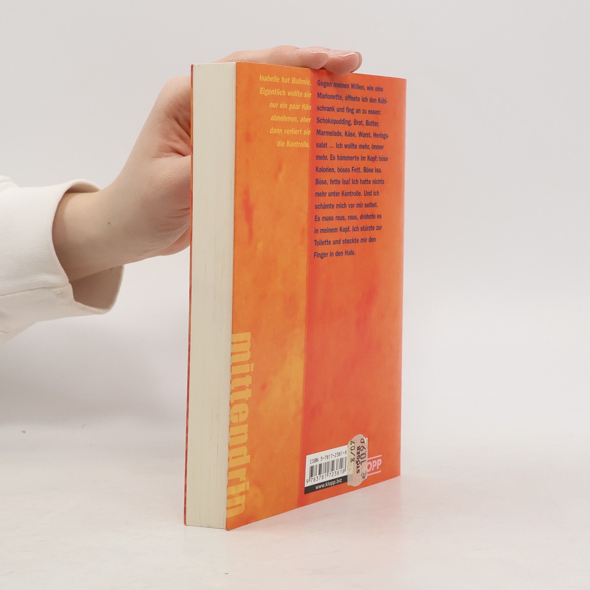 Isabelle sucht einen Weg aus dem Teufelskreis der Bulimie Eigentlich will Isabelle nur ein paar Kilo abnehmen - aber dann verliert sie die Kontrolle. Gegen ihren Willen, wie eine Marionette, geht sie immer wieder an den Kühlschrank: Schokopudding, Brot, Butter, Marmelade, Käse, Wurst, Heringssalat. Anschließend muss sie sich übergeben. Eines Tages bricht sie völlig entkräftet zusammen und beginnt eine Therapie. Doch der Weg zu einem normalen Essverhalten ist lang. Mit Kontaktadressen im Anhang. Zu diesem Buch gibt es eine Lehrerhandreichung, die als pdf zum download vorliegt oder gegen eine Schutzgebühr von EUR 3,-- beim Verlag erhältlich ist. Lehrerhandreichung als*. pdf (151 KB)