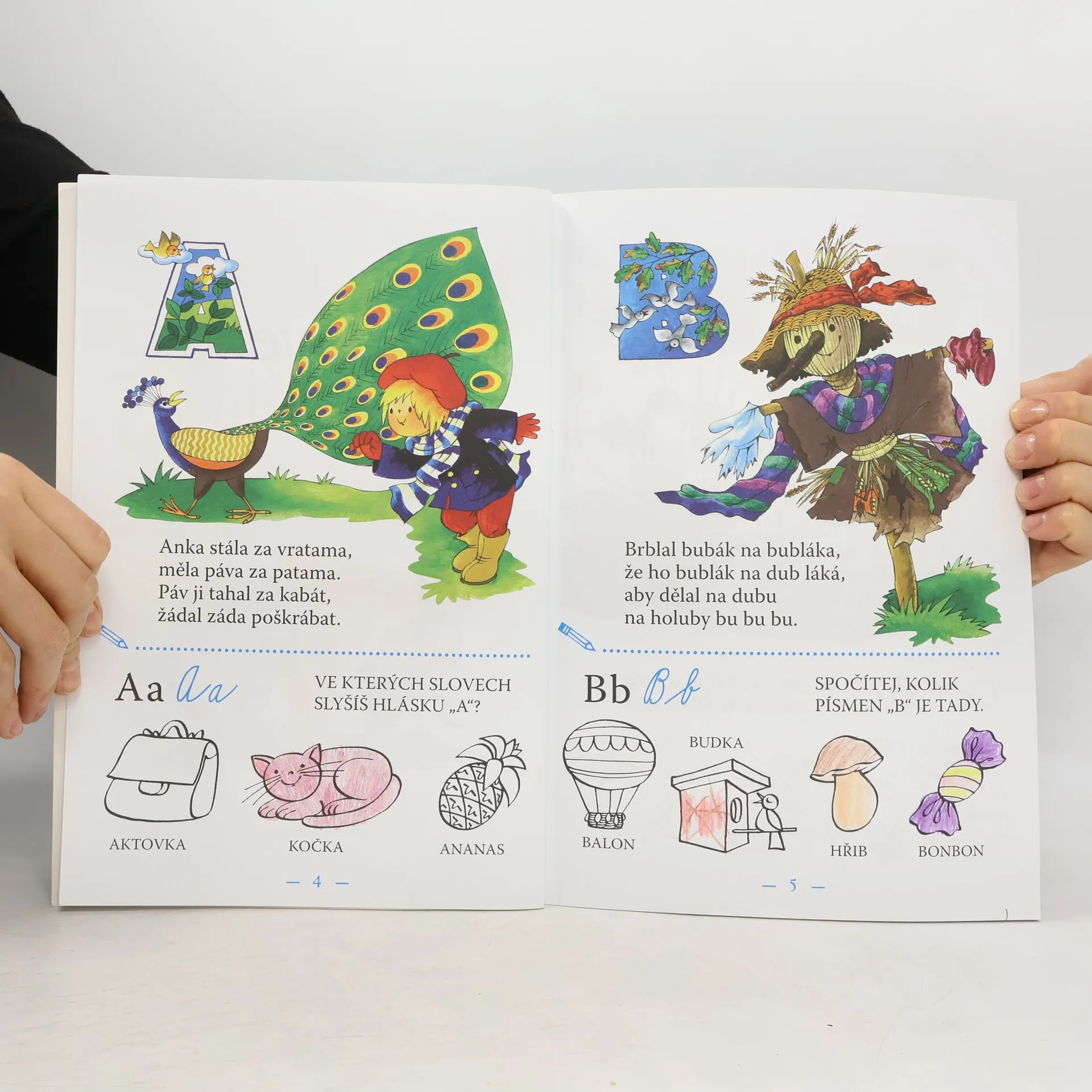 Krásná výpravná knížka, v níž jsou verše na jednotlivá písmena abecedy, dále tvary velkých i malách písmen tiskací a psací a jednoduché kresby reálií začínajících na jednotlivá písmena. V závěru knížky jsou verše na procvičování obtížných hlásek a také pohádky, v nichž je vtipný příběh kombinovaný s "jazykolamy