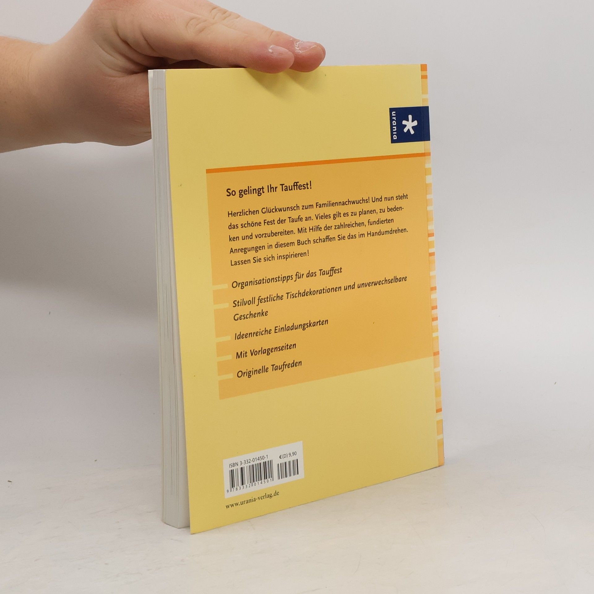 Die gelungene Tauffeier für alle Beteiligten: von Einladungskarten verschiedenster Stilrichtungen, über Tischdekorationen und Ideen für Give-aways oder Patengeschenke bis hin zu Textvorschlägen für Taufreden, Einladungen und Gratulationsworte, die vom Herzen kommen. Hilfreiche Tipps zum „Wann-wo-Wie?“ und für stressfreie Organisation runden diesen Allround-Ratgeber ab.