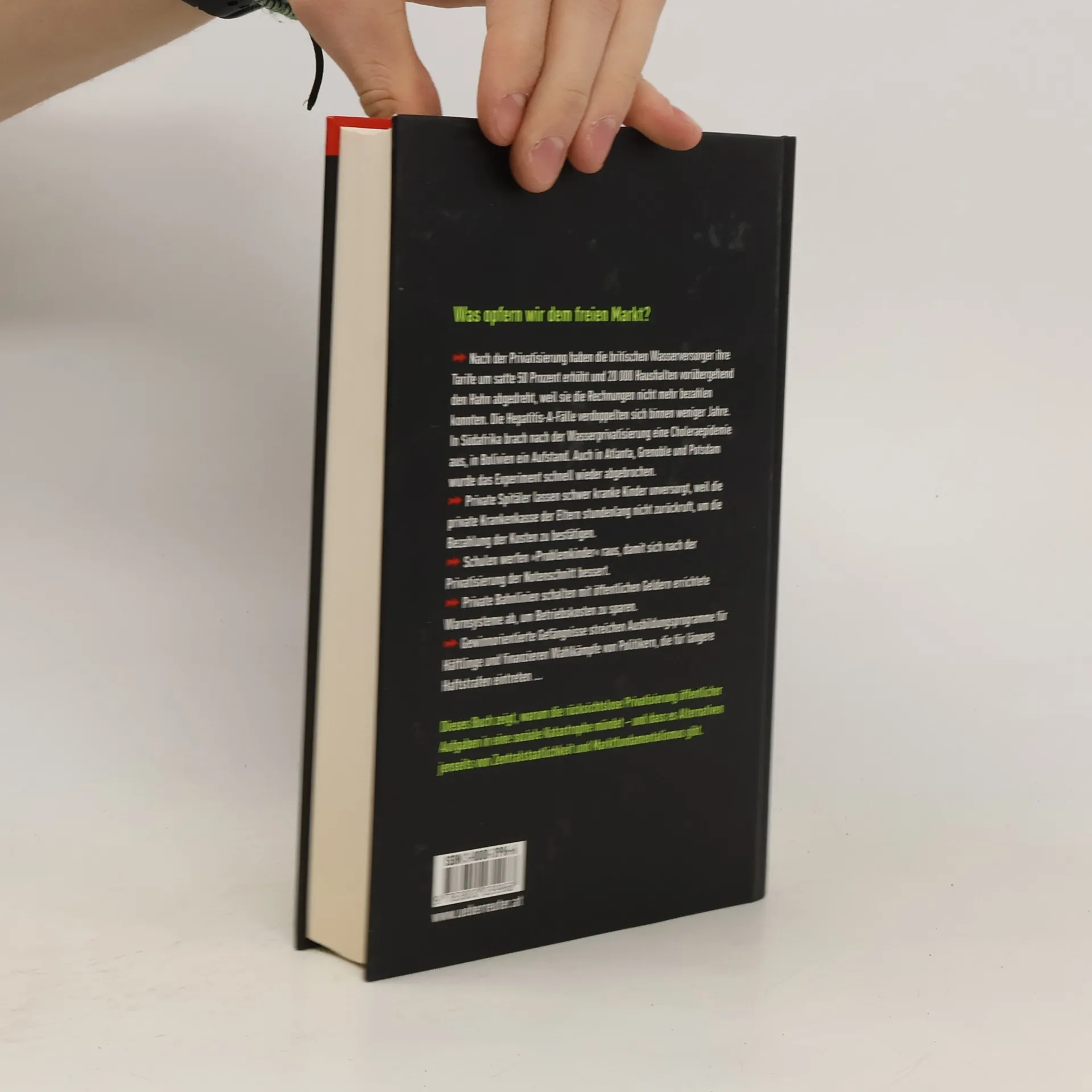 §B§Was opfern wir dem freien Markt?§S§Nach der Privatisierung haben die britischen Wasserversorger ihre Tarife um satte 50 Prozent erhöht und 20.000 Haushalten vorübergehend den Hahn abgedreht, weil sie die Rechnungen nicht mehr bezahlen konnten. Die Hepatitis-A-Fälle verdoppelten sich binnen weniger Jahre. In Südafrika brach nach der Wasserprivatisierung eine Choleraepidemie aus, in Bolivien ein Aufstand. Auch in Atlanta, Grenoble und Potsdam wurde das Experiment schnell wieder abgebrochen.§Private Spitäler lassen schwer kranke Kinder unversorgt, weil die private Krankenkasse der Eltern stundenlang nicht zurückruft, um die Bezahlung der Kosten zu bestätigen.§Schulen werfen "Problemkinder" raus, damit sich nach der Privatisierung der Notenschnitt bessert.§Private Bahnlinien schalten mit öffentlichen Geldern errichtete Warnsysteme ab, um Betriebskosten zu sparen.§Gewinnorientierte Gefängnisse streichen Ausbildungsprogramme für Häftlinge und finanzieren Wahlkämpfe von Politikern, die für längere Haftstrafen eintreten...§Dieses Buch zeigt, warum die rücksichtslose Privatisierung öffentlicher Aufgaben in eine soziale Katastrophe mündet - und dass es Alternativen gibt.