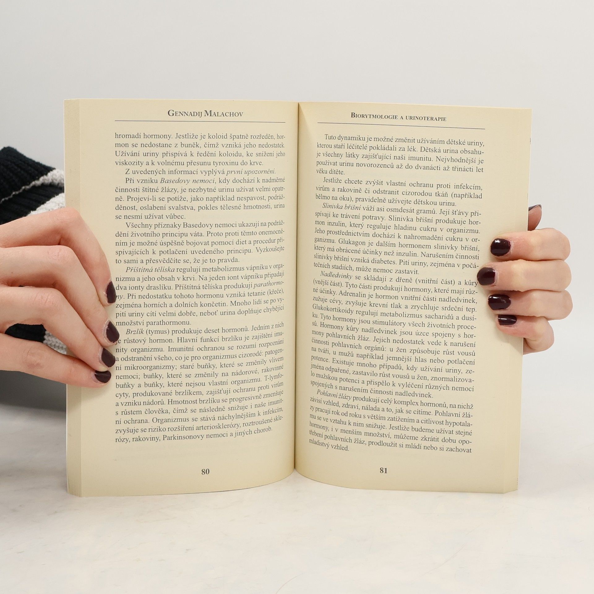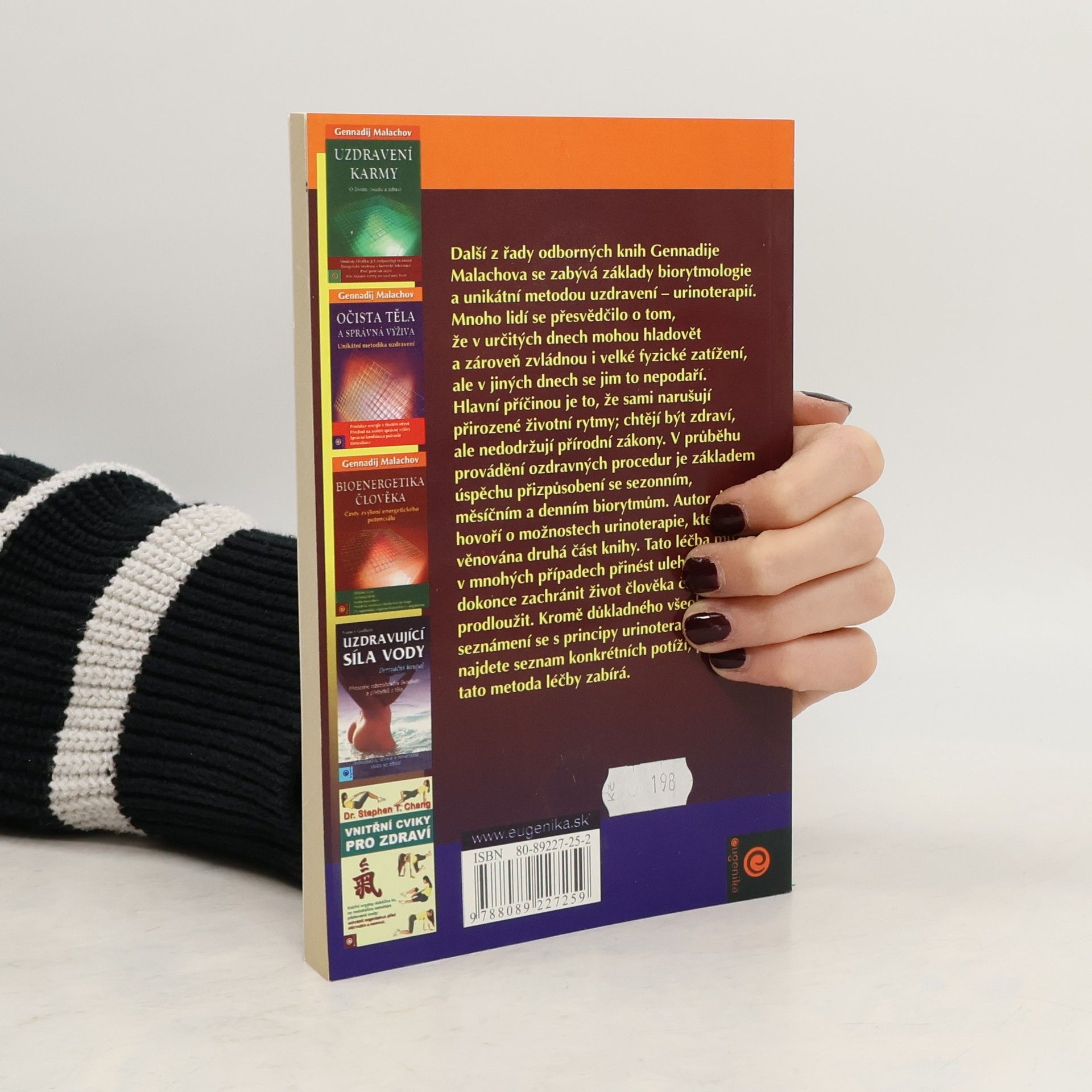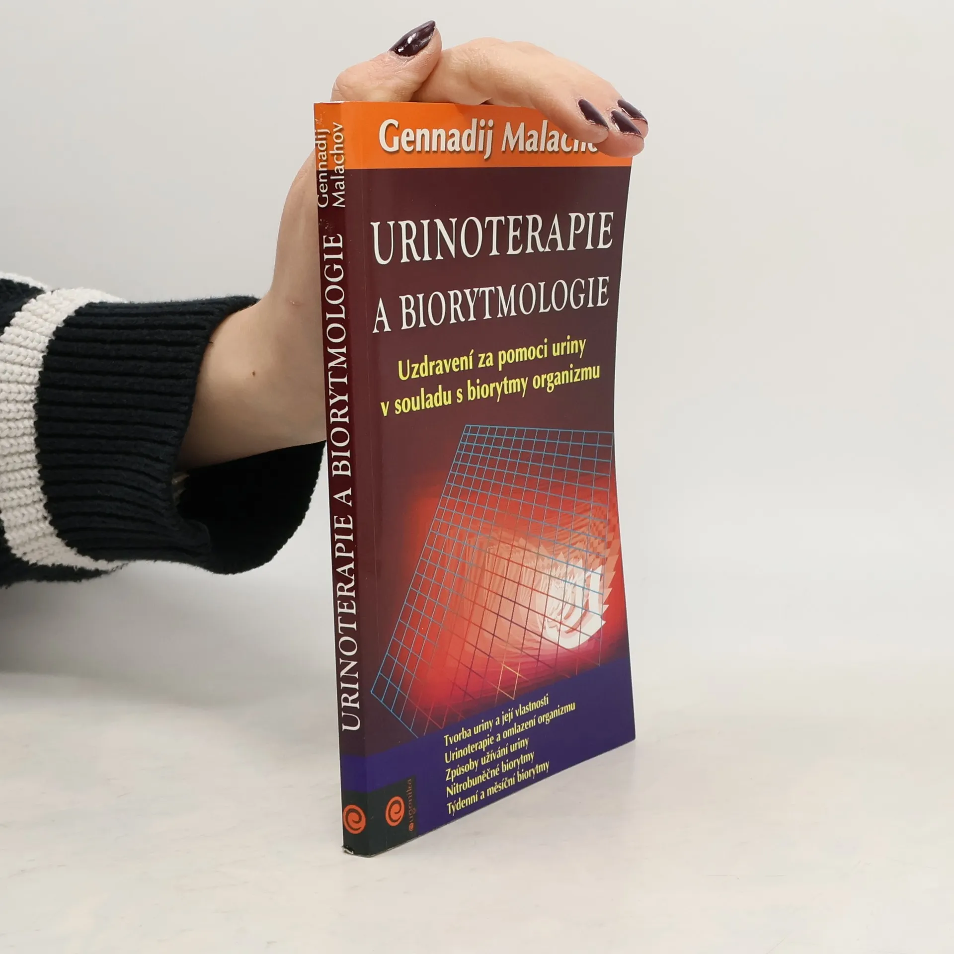 Tato kniha se zabývá základy biorytmologie a unikátní metodou uzdravení - urinoterapií. Mnoho lidí se přesvědčilo o tom, že v určitých dnech mohou hladovět a zároveň zvládnou i velké fyzické zatížení, ale v jiných dnech se jim to nepodaří. V průběhu provádění ozdravných procedur je základem úspěchu přizpůsobení se sezonním, měsíčním a denním biorytmům. Autor dále hovoří o možnostech urinoterapie, které je věnována druhá část knihy. Kromě důkladného všeobecného seznámení se s principy urinoterapie zde najdete seznam konkrétních potíží, při nichž tato metoda léčby zabýrá. Publikace: Urinoterapie a biorytmologie - Gennadij Malachov. Další z řady odborných knih Gennadije Malachova se zabývá základy biorytmologie a unikátní metodou uzdravení - urinoterapií.Kromě důkladného všeobecného seznámení se s principy urinoterapie zde najdete seznam konkrétních potíží, při nichž tato metoda metoda léčby zabíra.