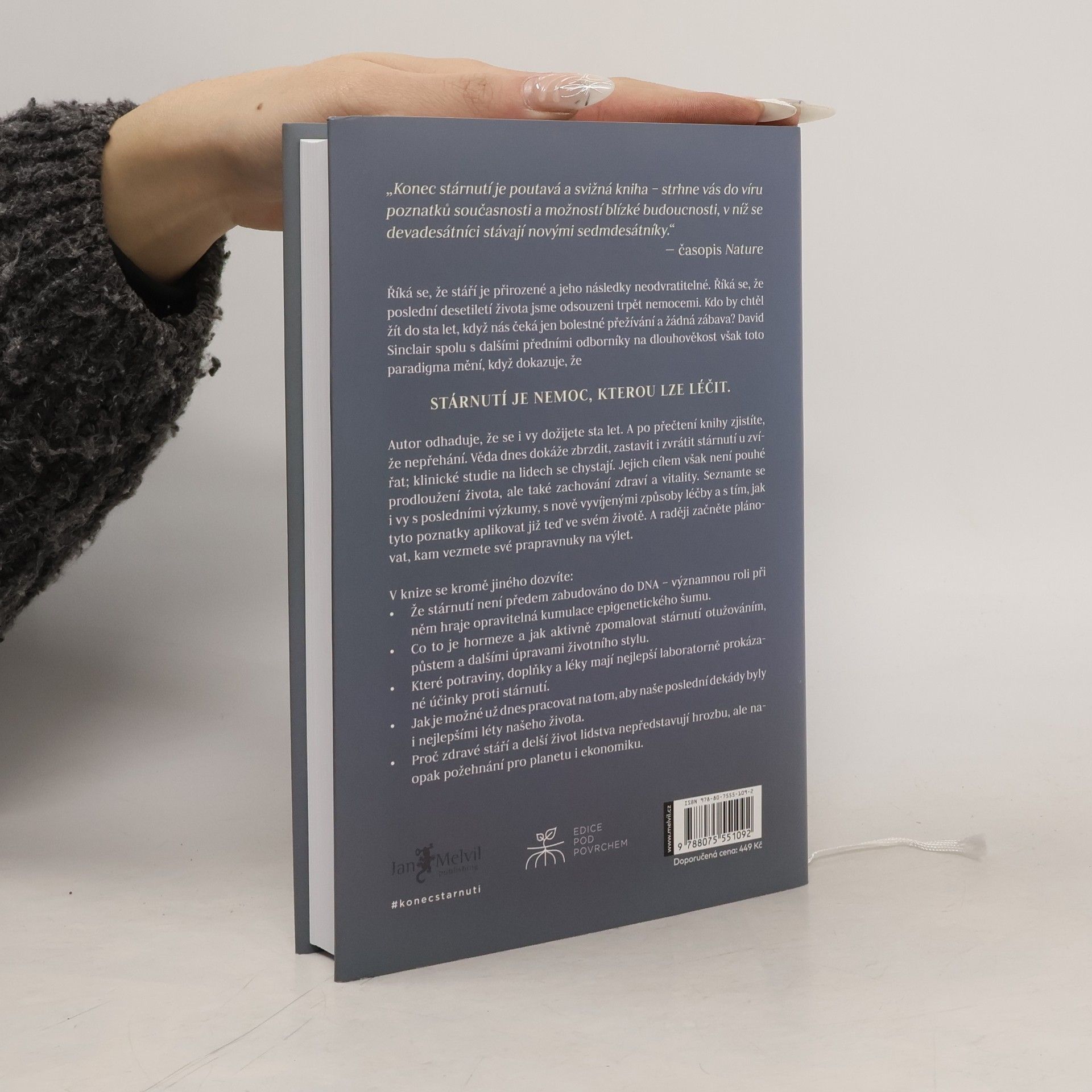 Říká se, že stáří je přirozené a jeho následky neodvratitelné. Říká se, že poslední desetiletí života jsme odsouzeni trpět nemocemi. Kdo by chtěl žít do sta let, když nás čeká jen bolestné přežívání a žádná zábava? David Sinclair spolu s dalšími předními odborníky na dlouhověkost však toto paradigma mění, když dokazuje, že STÁRNUTÍ JE NEMOC, KTEROU LZE LÉČIT. Autor odhaduje, že se i vy dožijete sta let. A po přečtení knihy zjistíte, že nepřehání. Věda dnes dokáže zbrzdit zastavit i zvrátit stárnutí zvířat, klinické studie na lidech se chystají. Jejich cílem však není pouhé prodloužení života, ale také zachování zdraví a vitality. Seznamte se i vy s posledními výzkumy, s nově vyvíjenými způsoby léčby a s tím, jak tyto poznatky aplikovat již teď ve svém životě. A raději začněte plánovat, kam vezmete své prapravnuky na výlet. V knize se mimo jiné dozvíte - Že stárnutí není předem zabudováno do DNA – významnou roli při něm hraje opravitelná kumulace epigenetického šumu. - Co je to hormeze a jak aktivně zpomalovat stárnutí otužováním, půstem a dalšími úpravami životního stylu. - Které potraviny, doplňky a léky mají nejlepší laboratorně prokázané účinky proti stárnutí. - Jak je možné už dnes pracovat na tom, aby naše poslední dekády byly i nejlepšími léty našeho života. - Proč zdravé stáří a delší život lidstva nepředstavují hrozbu, ale naopak požehnání pro planetu i ekonomiku.