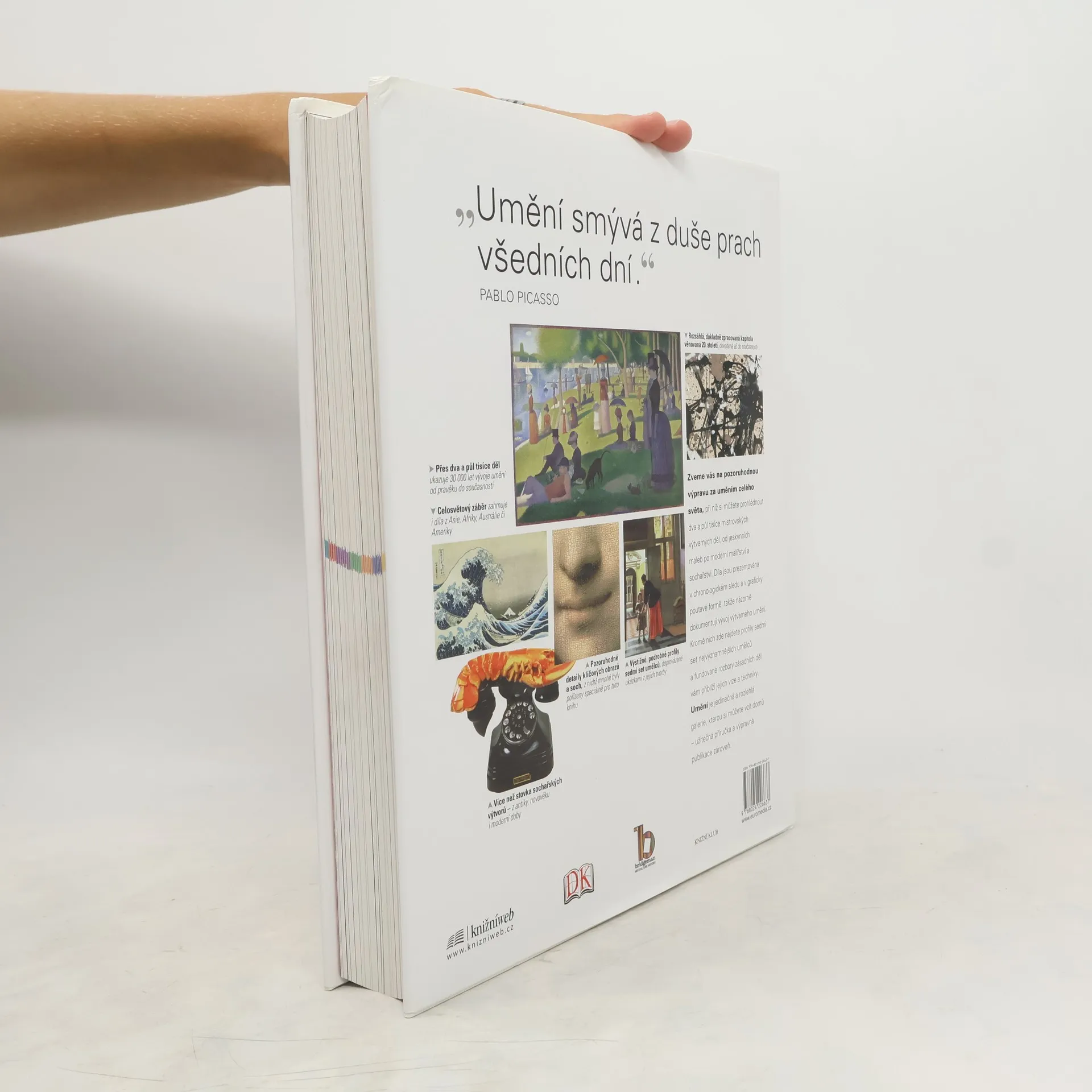 Zveme vás na pozoruhodnou výpravu za uměním celého světa, při níž si můžete prohlédnout dva a půl tisíce mistrovských výtvarných děl, od jeskynních maleb po moderní malířství a sochařství. Díla jsou prezentována v chronologickém sledu a v graficky poutavé formě, takže dobře dokumentují vývoj výtvarného umění. Kromě nich zde najdete profily sedmi set nejvýznamnějších umělců a podrobné, fundované rozbory klíčových děl vám přiblíží jejich vize a techniky. Umění je jedinečná a rozlehlá galerie, kterou si můžete vzít domů – užitečná příručka a výpravná publikace zároveň.