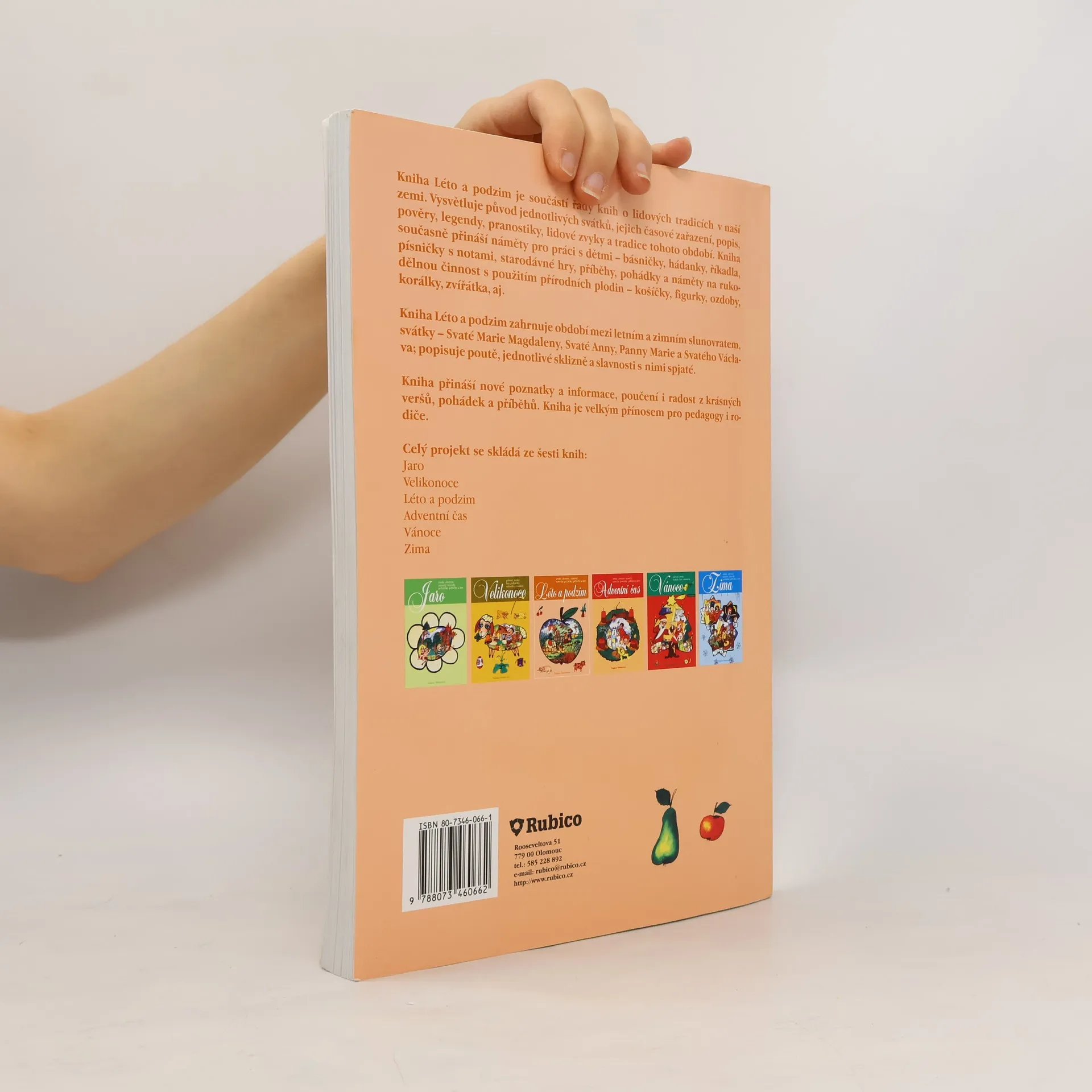Výborná kniha z edice o lidových tradicích a zvycích v naší zemi. Jedná se o šest samostatných publikací: Zima, Jaro, Velikonoce, Léto a podzim, Adventní čas, Vánoce. V knize naleznete: charakteristiku období, pověry, legendy, pranostiky, lidové zvyklosti a tradice, jejich původ a využití v práci s dětmi - básničky, hádanky, lidová vinšování a říkadla, písničky, povídky, pohádky a náměty pro rukodělnou činnost. Období zahrnuje světce a zvyklosti: Svatá Magdalena, Svatá Anna, Panna Maria, Svatý Václav, dožínky, dočesná, vinobraní, len a konopí, brambory, řepa, ovoce a zelenina, poutě. Můžete se s knihou naučit starodávné dětské hry s míčem, blechou a špačkem