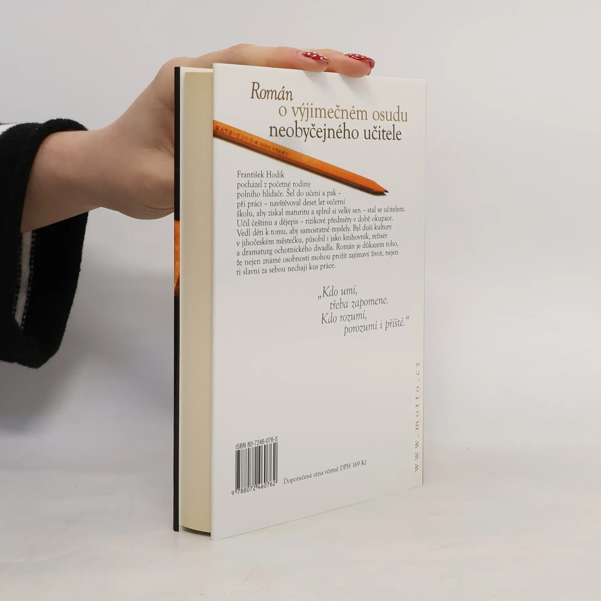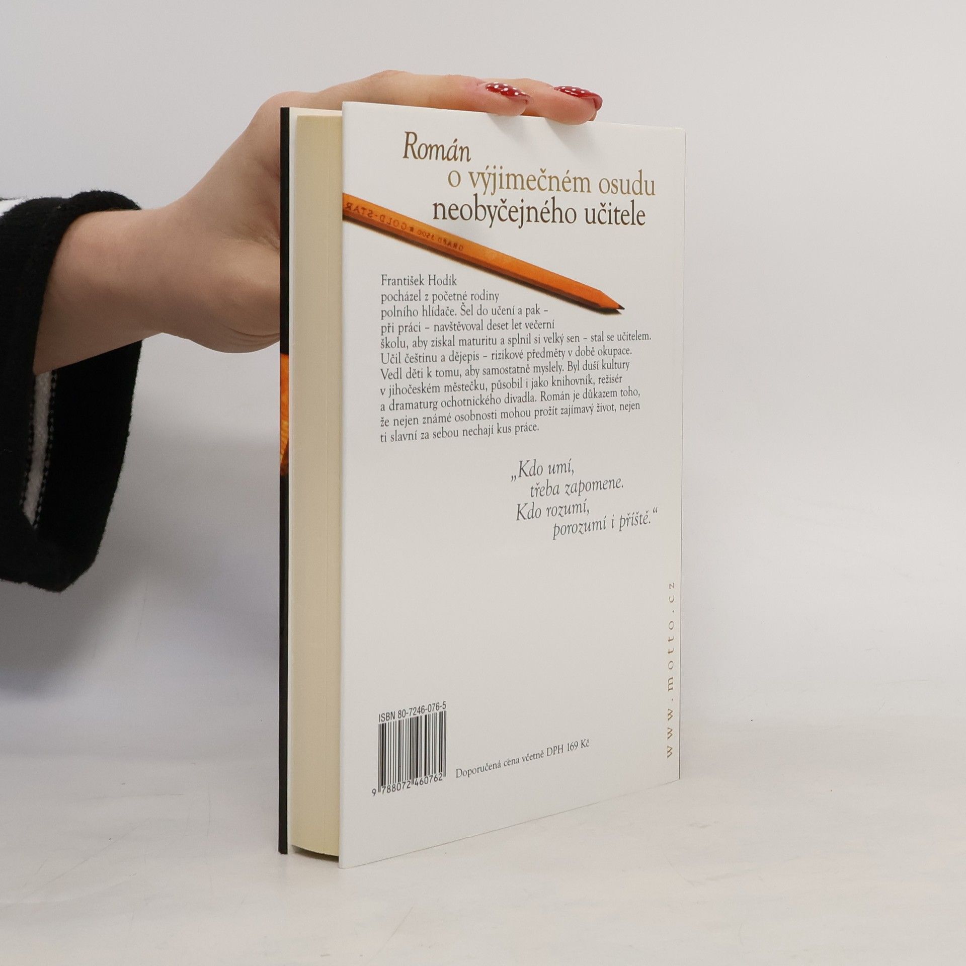 Román o výjimečném osudu neobyčejného českého učitele. František Hodík pocházel z početné rodiny, šel do učení a pak při práci navštěvoval večerní školu, aby získal maturitu a splnil si velký sen - stal se učitelem. V románu vypráví autorka o nelehkém postavení českého učitele v pohraniční oblasti i o bídě učitelského povolání. Po okupaci Československa se dostává do jihočeských Bernartic, kde se seznamuje s rodinou Di Lottiů, kteří se objevují v autorčině románu Doktorka z domu Trubačů. Koncem války ho stihne stejný osud - poslední den války je společně s Di Lottiovými zastřelen. Autorka ale sleduje i hrátky osudu s oběma rodinami, jejich propojení i osudy do dnešních dnů.