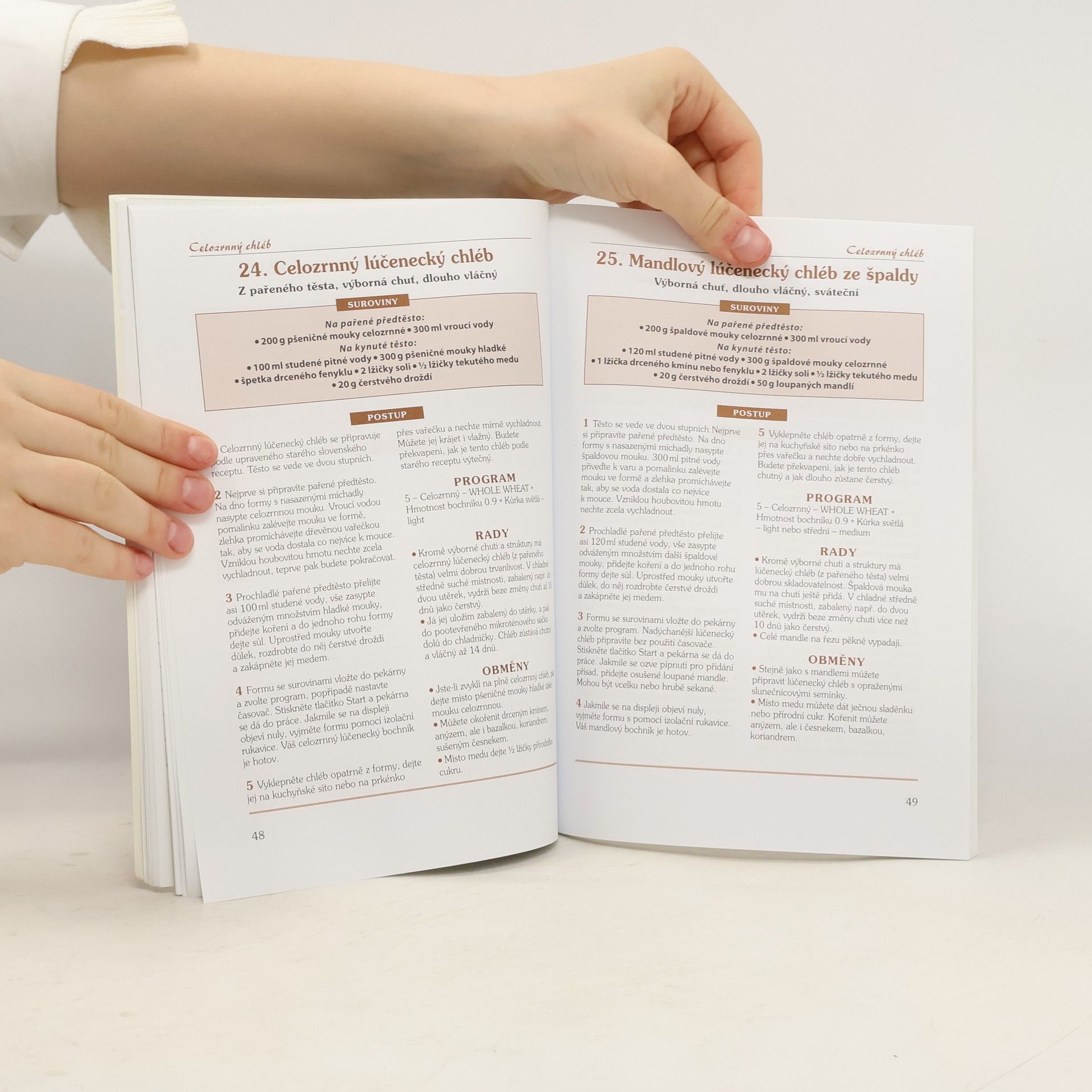 Recepty z této publikace zahrnují chléb z celozrnných mouk (pšenice, žito, sója kukuřice), na chléb z bílé mouky, na chléb kynutý s droždím i kvasem, přípravou domácího kvasu, ale i recepturami na slané a sladké pečivo včetně rohlíků, housek, baget, pizzy, koláčů, vánoček atd. V neposlední řadě zde naleznete P. Momčilovou vyzkoušenou jednoduchou přípravu skvělých džemů a povidel.