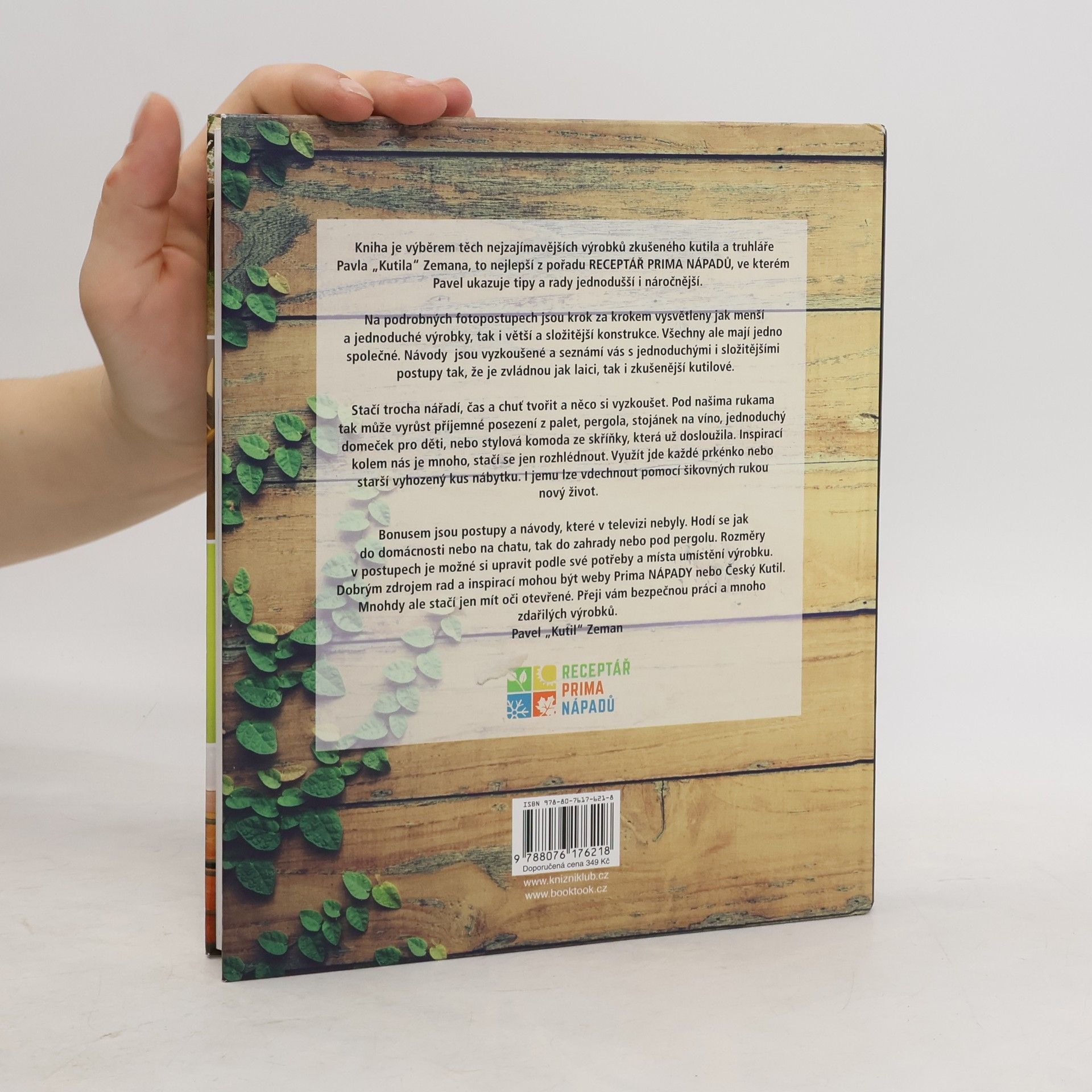 Kutil Pavel Zeman, známý z RECEPTÁŘE Prima nápadů, sestavil čtyřicet podrobných návodů na nejrůznější výrobky pro domácnost i zahradu. Uvádí vždy podrobný seznam materiálu i potřebných nástrojů, navíc přidává podrobný fotografický návod, jak postupovat. S jeho pomocí si můžeme vyrobit lucernu na zahradu či letní domeček pro děti, servírovací podnos, stolek na balkon, stojánek na vánoční stromeček či dokonce dřevěný batoh. Poradí ale i s drobnými opravami, například jak vyměnit práh, opravit dlažbu či vyštíplý pant.