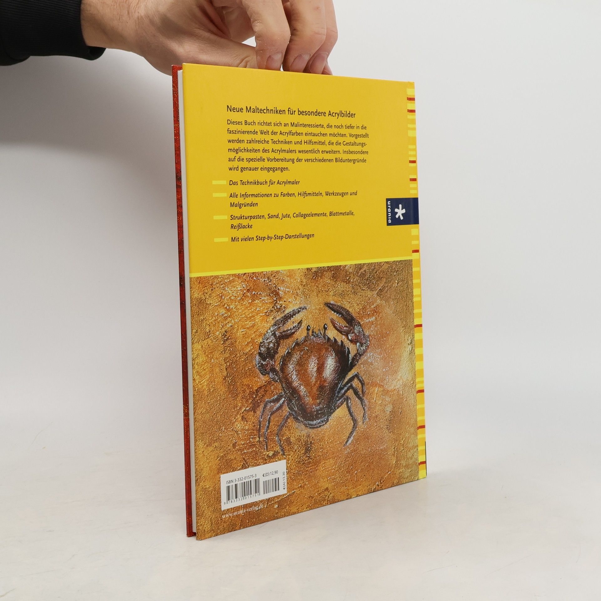 Dieses Buch ist eine Bereicherung für alle, die schon mit Acrylfarben gearbeitet haben, mit den speziellen Eigenschaften dieser Farben vertraut sind und nach Möglichkeiten suchen, um ihren Arbeiten einen neuen Ausdruck zu verleihen. Vorgestellt werden Techniken und spezielle Effekte aus der Acrylmalerei, die Schritt für Schritt erlernt und eingesetzt werden können. Im Mittelpunkt steht die effektvolle Ausarbeitung eines Motivs. Folgende Techniken werden präsentiert: Fresco-Imitat, kalligraphische Elemente, Effekte mit Schablonen, Malen auf Malgrund mit grober Textur, impressionistischer Malstil, Arbeiten mit Reißlack, Collageelemente und vieles mehr.