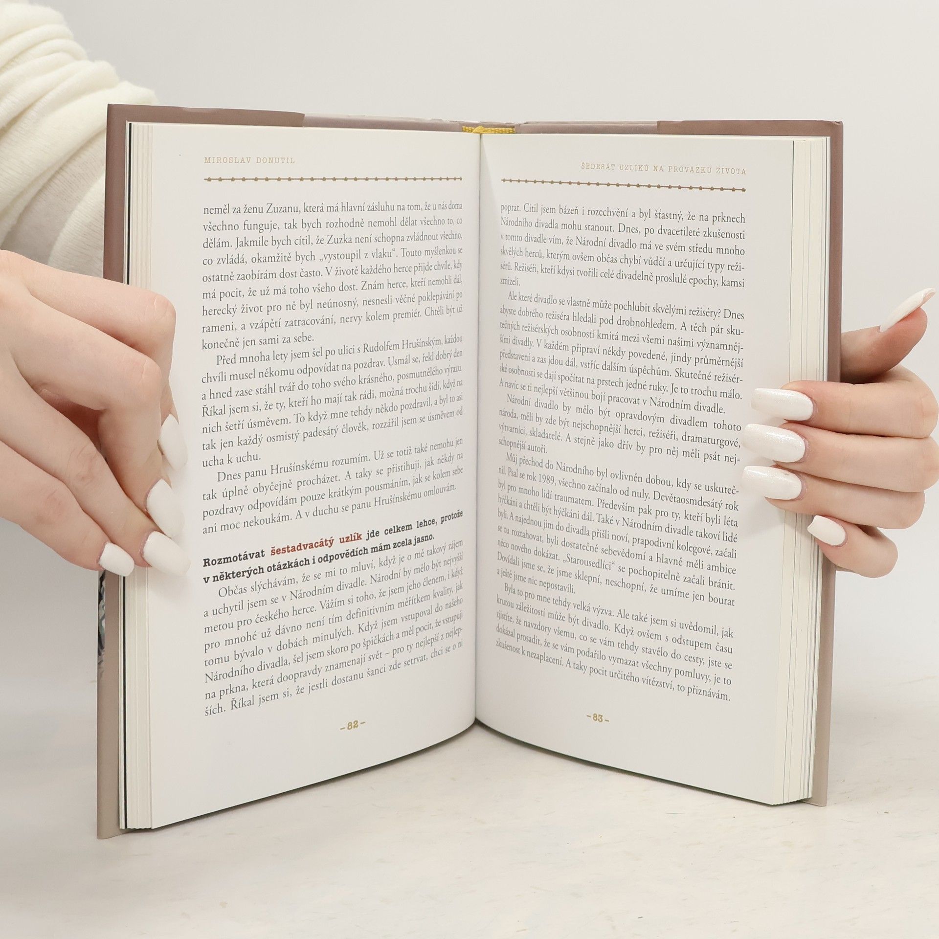 Život je jako hra, nezáleží ani tak na tom, jak dlouho trvalo představení, ale jak dobře bylo zahráno. To už kdysi dávno vymyslel Seneca. Miroslav Donutil má štěstí. Hraní a život se mu prolínají a když se rozhodne napsat o tom knížku, rozhodně má o čem psát. A jedno je jisté. S uzlíky, které ve svém životě rozmotává, se potýkáme každý z nás. O to zajímavější konfrontace nás při čtení nové knihy Miroslava Donutila čeká.