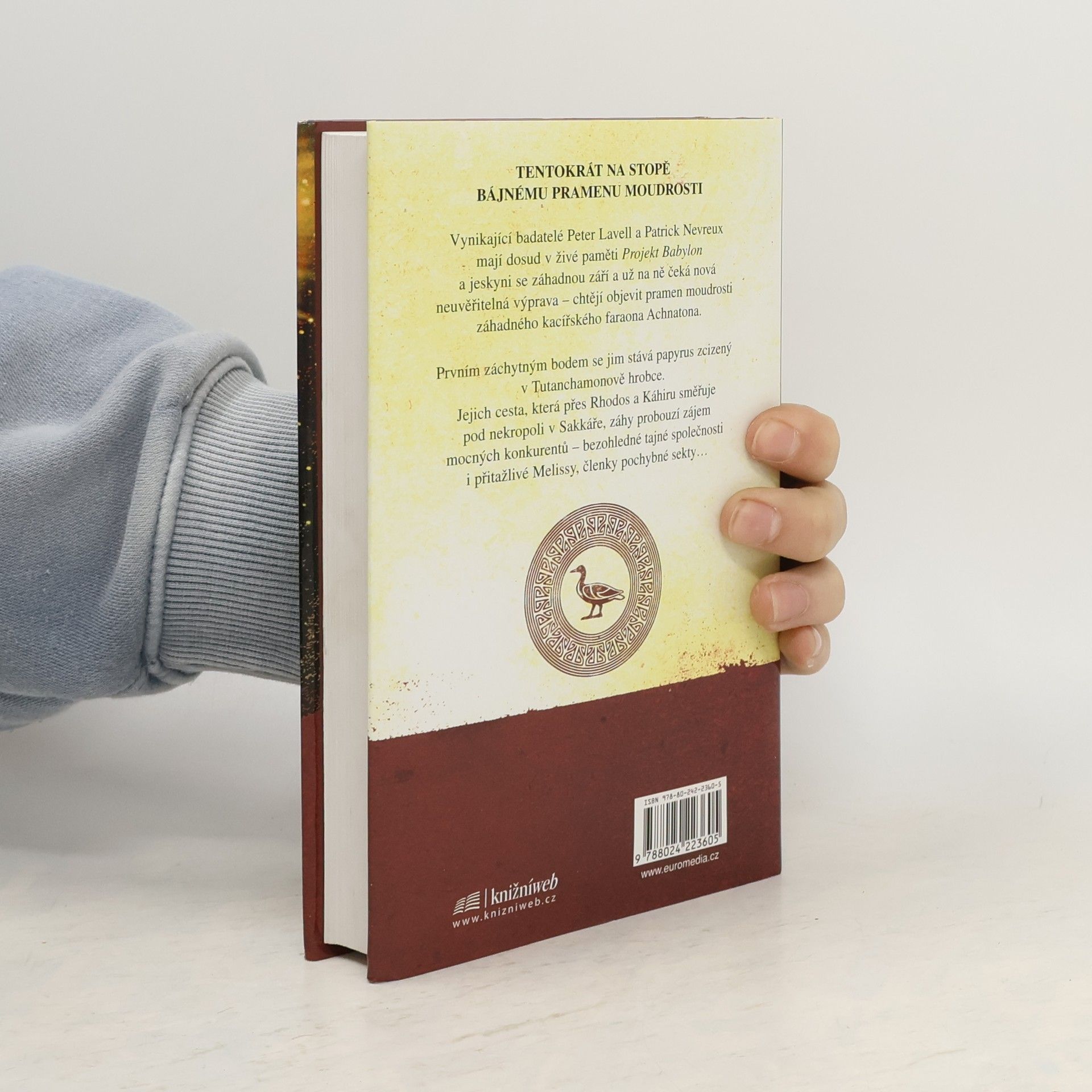 Další fascinující dobrodružství badatelského týmu z Projektu Babylon Výzkum záhadné jeskyně v jižní Francii svedl dohromady anglického historika Petera Lavella a francouzského amatérského archeologa Patricka Nevreuxe. Od doby, kdy objevili jedinečný archiv vědění, nemyslí na nic jiného, než že vypátrají další svědectví o starodávné moudrosti a mystice. Nečekaně dostanou pozvání do Káhiry od stařičkého sira Olivera Guardnera, jemuž otec odkázal drahocennou sbírku staroegyptských nálezů. Nebylo mu bohužel dopřáno pátrání po "vědění světa" a "původu magie" dokončit, protože ve třicátých letech záhadně zahynul. Oba dobrodruhy fascinuje vyhlídka, že znovu vykročí po této stopě a dílo zesnulého úspěšně završí. Východiskem se pro ně stane papyrus zcizený z Tutanchamonova hrobu. Obsah písemnosti je přivede na stopu tajuplného kacířského faraona Achnatona a bájemi opředené Tabula smaragdina. Pátrání pokračuje na ostrově Rhodos a v Káhiře, hluboko pod nekropolí v Sakkáře a směřuje k netušeným kořenům lidských dějin. Jejich výprava však záhy probouzí zájem mocných konkurentů, například tajné společnosti, která oběma mužům nepokrytě vyhrožuje, i přitažlivé Melissy, jež je členkou pochybné sekty. Když Peter a Patrick nakonec objeví utajený Imhotepův hrob, vystavují se sami největšímu nebezpečí…