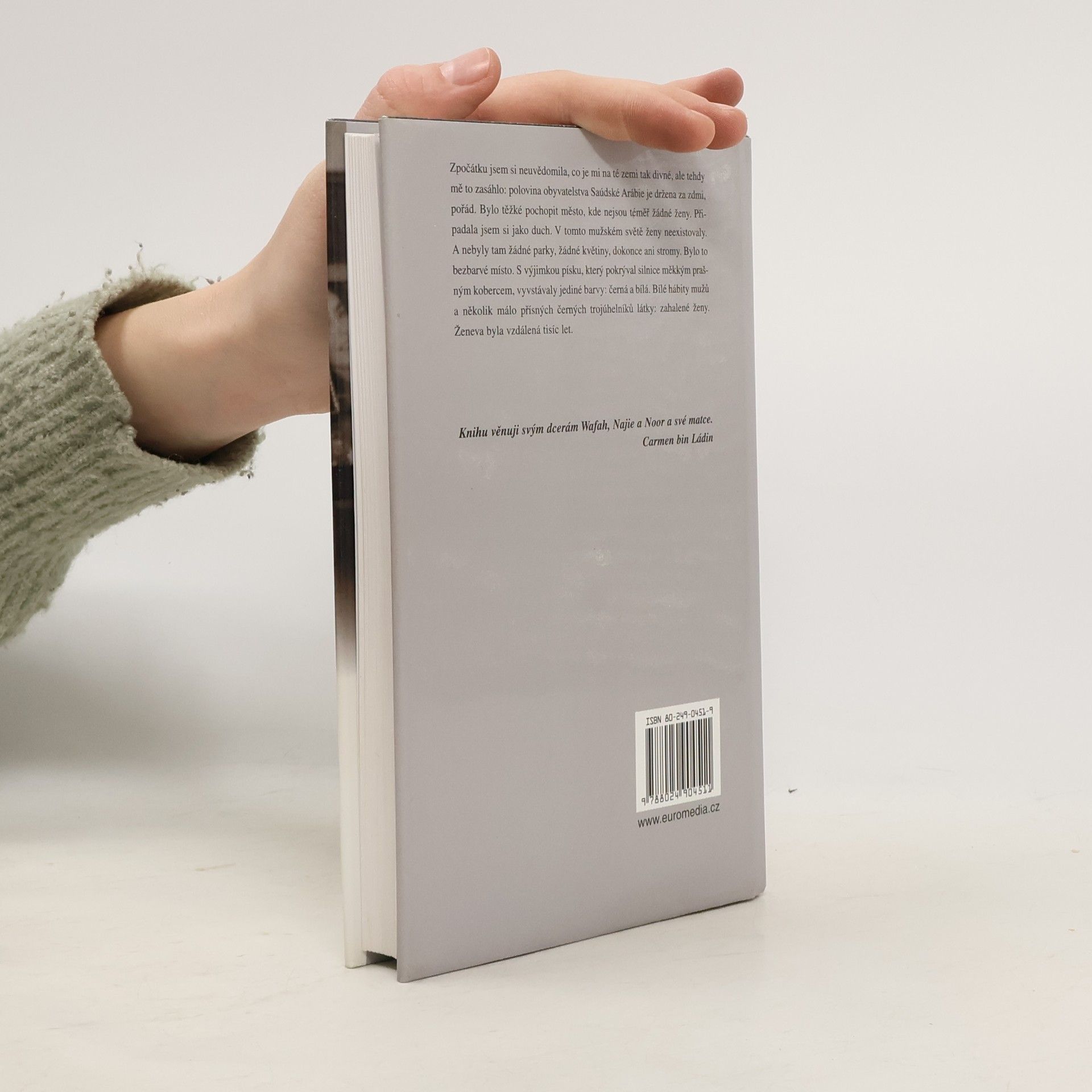 Málokdo měl možnost nahlédnout do soukromí arabských šejků, a to obzvlášť z pohledu ženy, která se dostala do rodiny jako je klan Bin Ládinů. Autorčiny životní osudy nás zavedou do jednoho z nejtajemnějších království světa, kde panují podmínky nepochopitelné pro moderní západní svět a kde je pojem demokracie v rozporu s "čistým" životem podle koránu. Carmen Dufourová, narozená ve Švýcarsku v bohaté persko-švýcarské rodině, studovala na prestižních školách a cestovala se svými sestrami. Po matce, pocházející z perské aristokracie, zdědila impulzivní povahu, která ji přivedla k dobrodružství, jež ovlivnilo její život. I když zpočátku váhala se svatbou s Jislamem bin Ládinem, nakonec podlehla naléhání a souhlasila. V Saúdské Arábii zjistila, kým Bin Ládinové jsou - bohatou a mocnou rodinou s historickými kořeny. Ženy žily za zavřenými dveřmi, zatímco muži mohli volně přicházet a odcházet. Carmen se ocitla v izolaci, bez možnosti vyjít ven nebo řídit auto, a její život se scvrkl na malý prostor. Čelila zoufalství a hledala cesty, jak zlepšit podmínky pro sebe a své dcery. Když se její vztahy s manželem zhoršily, žila v obavách z rozvodu a ztráty dětí. Tato hrozba ji přiměla k radikálnímu kroku. Příběh ženy, která strávila desetiletí za vysokými zdmi arabského domu, odhaluje zákulisí rodiny jednoho z nejhledanějších teroristů a ukazuje neslučitelnost obou kultur.