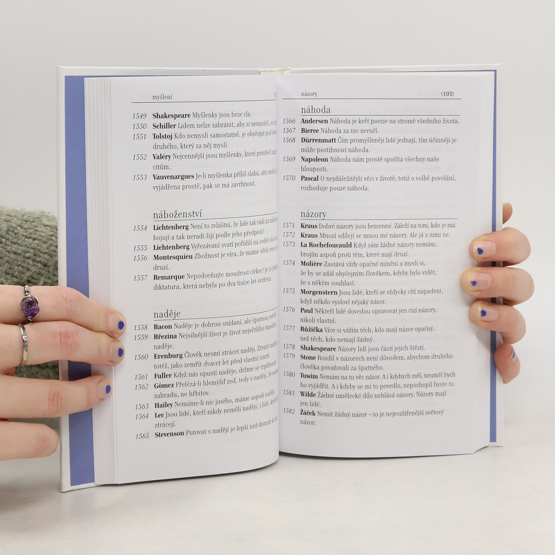 Knížka je jedinečnou sbírkou citátů a aforismů slavných, při nichž se nejen pobavíte, ale s úspěchem je využijete při nejrůznějších společenských příležitostech, anebo vás inspiruje při psaní dopisů, přání aj. Propracovaný podrobný rejstřík vám pomůže najít to správné moudro pro všední rozhovory, oslavné i mílostné maily či motto pro vlastní radosti a strasti. Soupis autorů se stručnou charakteristikou je pak malou encyklopedií slavných i neslavných osobností.... celý text
