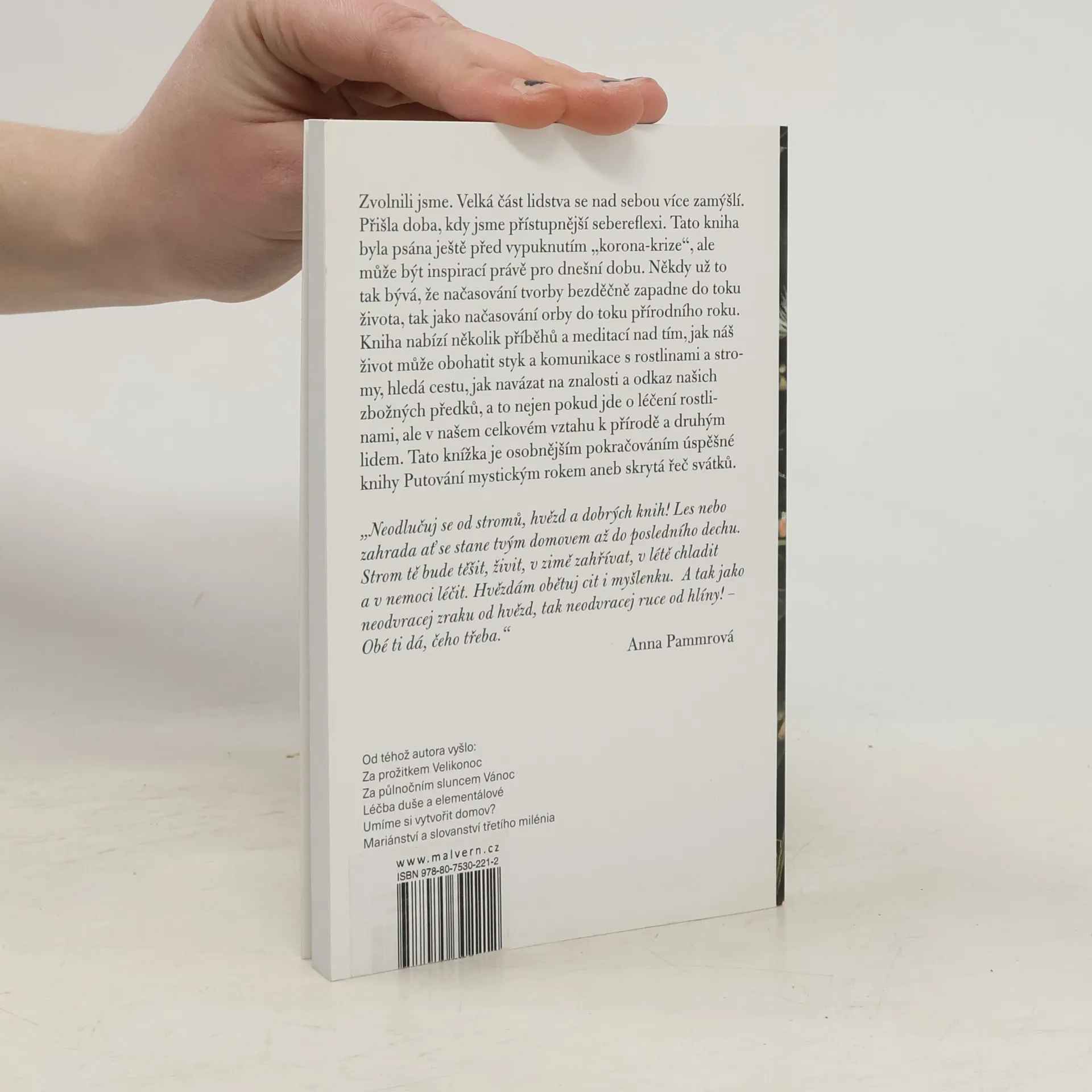 Zvolnili jsme. Velká část lidstva se nad sebou více zamýšlí. Přišla doba, kdy jsme přístupnější sebereflexi. Tato kniha byla psána ještě před vypuknutím "korona-krize", ale může být inspirací právě pro dnešní dobu. Někdy už to tak bývá, že načasování tvorby bezděčně zapadne do toku života, tak jako načasování orby do toku přírodního roku. Kniha nabízí několik příběhů a meditací nad tím, jak náš život může obohatit styk a komunikace s rostlinami a stromy, hledá cestu, jak navázat na znalosti a odkaz našich zbožných předků a to nejen pokud jde o léčení rostlinami, ale v našem celkovém vztahu k přírodě a druhým lidem. Tato knížka je osobnějším pokračováním úspěšné knihy Putování mystickým rokem aneb skrytá řeč svátků.