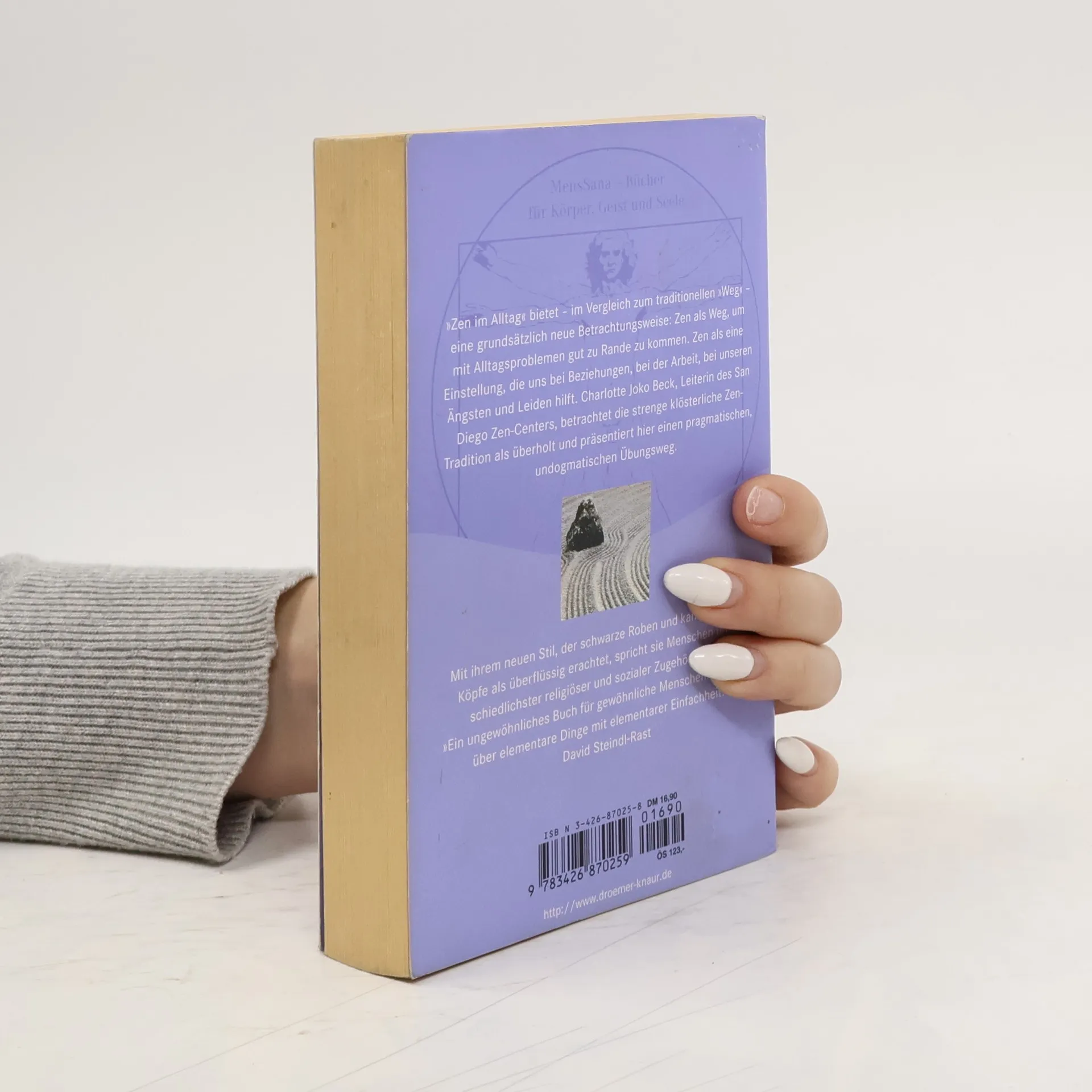 „Zen im Alltag“ bietet - im Vergleich zum traditionellen „Weg“ - eine grundsätzlich neue Betrachtungsweise: Zen als Weg, um mit Alltagsproblemen gut zu Rande zu kommen. Zen als Einstellung, die uns bei Beziehungen, bei der Arbeit, bei unseren Ängsten und Leiden hilft. Charlotte Joko Beck, Leiterin des San Diego Zen-Centers, betrachtet die strenge klösterliche Zen-Tradition als überholt und präsentiert hier einen pragmatischen, undogmatischen Übungsweg. Mit ihrem neuen Stil, der schwarze Roben und kahlgeschorene Köpfe als überflüssig erachtet, spricht sie Menschen unterschiedlichster religiöser und sozialer Zugehörigkeit an. REASON: review already exists
