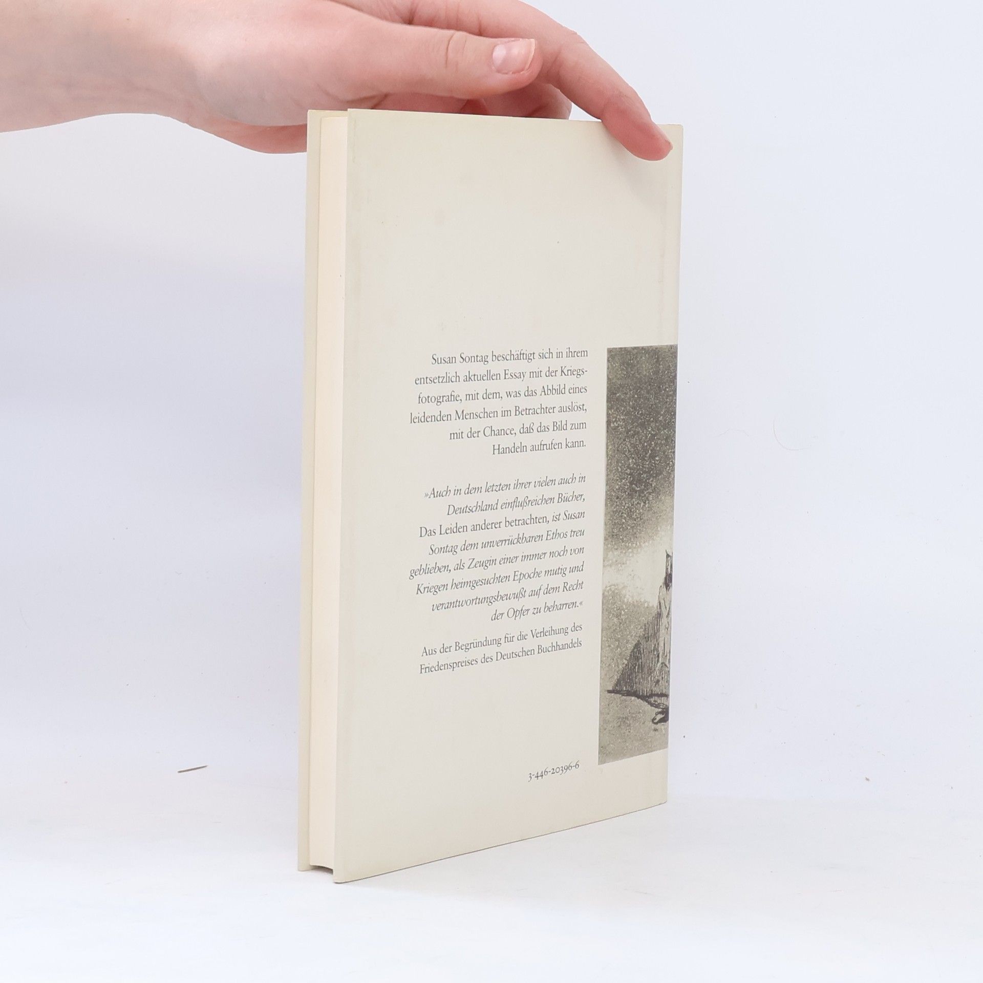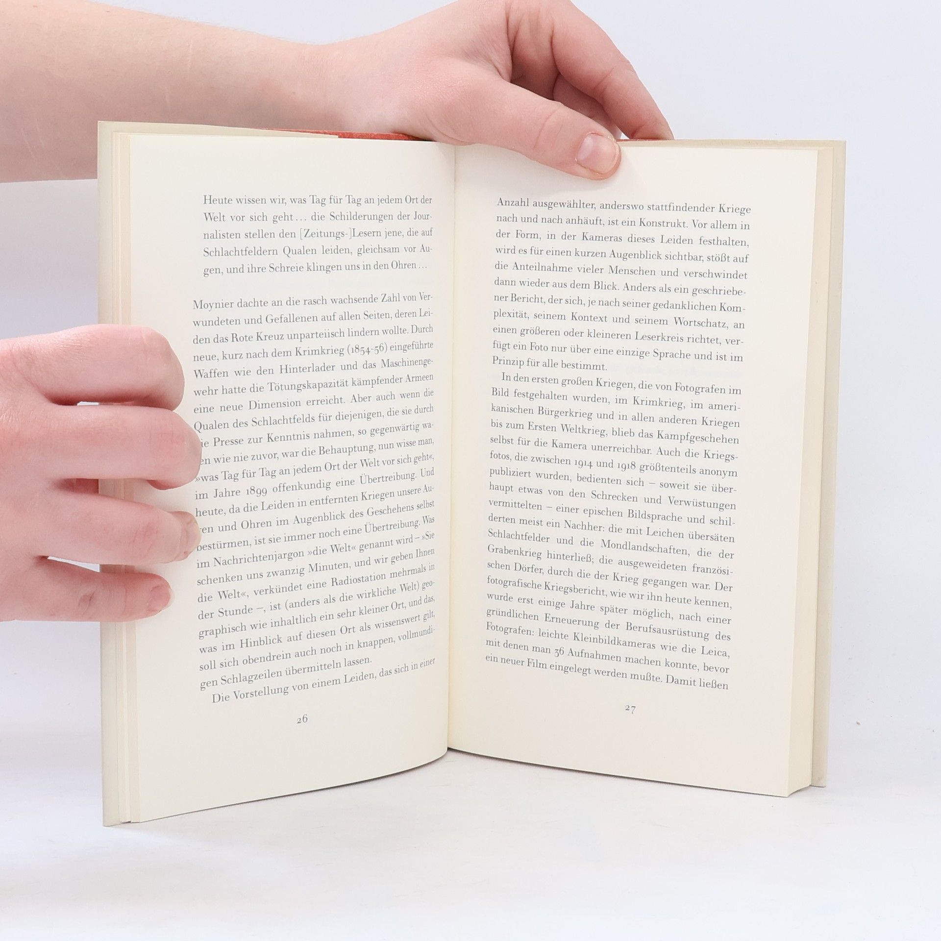 Fünfundzwanzig Jahre nach ihrem Epoche machenden Essay „Über Fotografie“ beschäftigt sich Susan Sontag mit dem Thema Kriegsfotografie: Sie rekapituliert die historische Entwicklung, nennt die Vorläufer der Dokumentaristen des Krieges und revidiert ihre einstige Ansicht, dass der Mensch durch solche Bilder abstumpfe. Im Gegenteil: „Das Bild sagt: setz dem ein Ende, interveniere, handle. Und dies ist die entscheidende, die korrekte Reaktion.“