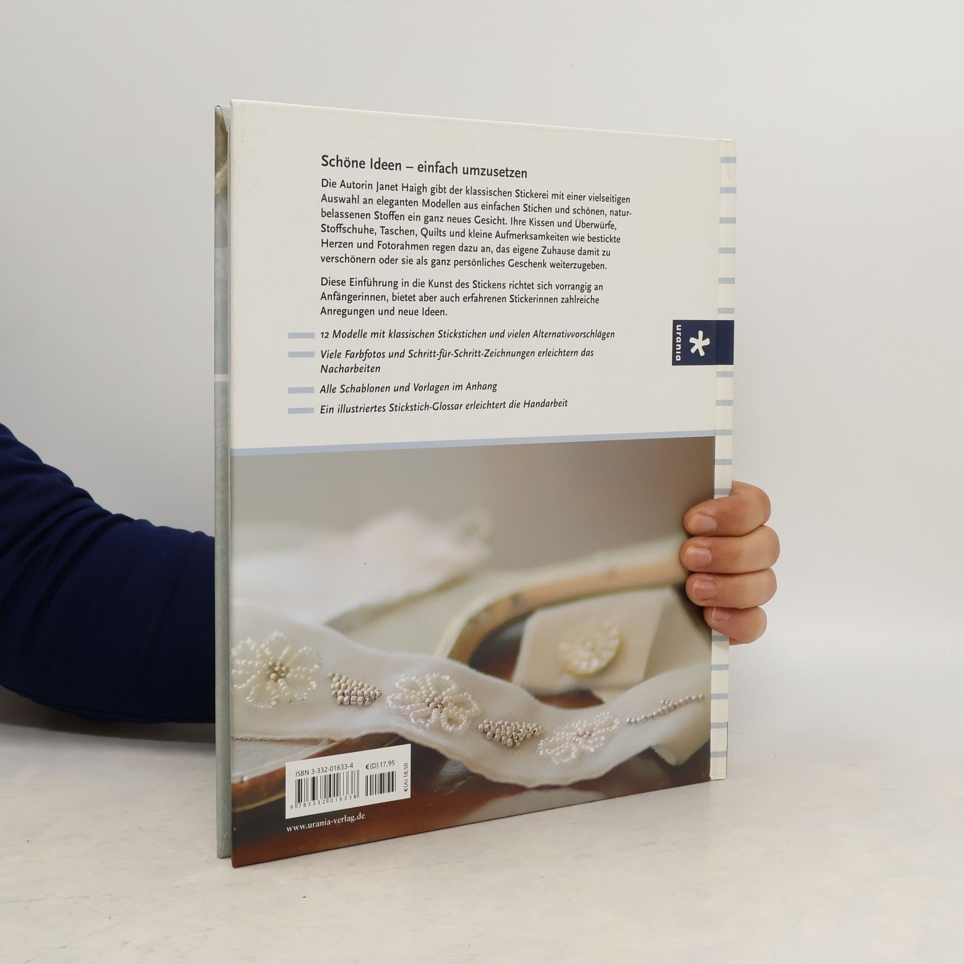 Die Autorin Janet Haigh gibt der klassischen Stickerei mit einer vielseitigen Auswahl an eleganten Modellen aus einfachen Stichen und schönen, naturbelassenen Stoffen ein ganz neues Gesicht. Ihre Kissen und Überwürfe, Stoffschuhe, Taschen, Quilts und kleine Aufmerksamkeiten wie bestickte Herzen und Fotorahmen regen dazu an, das eigene Zuhause zu verschönern oder sie als ganz persönliches Geschenk weiterzugeben. Diese Einführung in die Kunst des Stickens richtet sich an Anfängerinnen, bietet aber auch erfahrenen Stickerinnen zahlreiche neue Ideen.