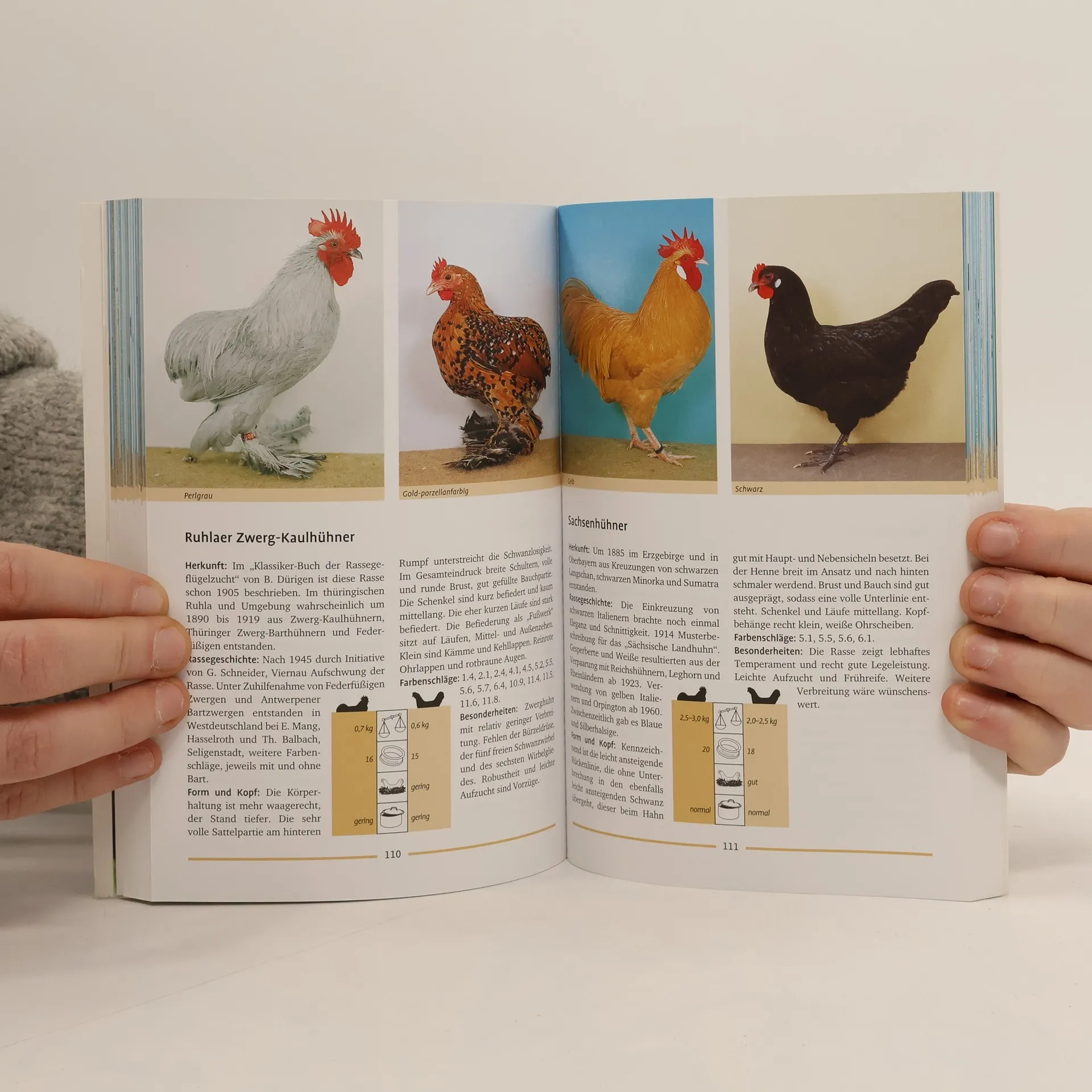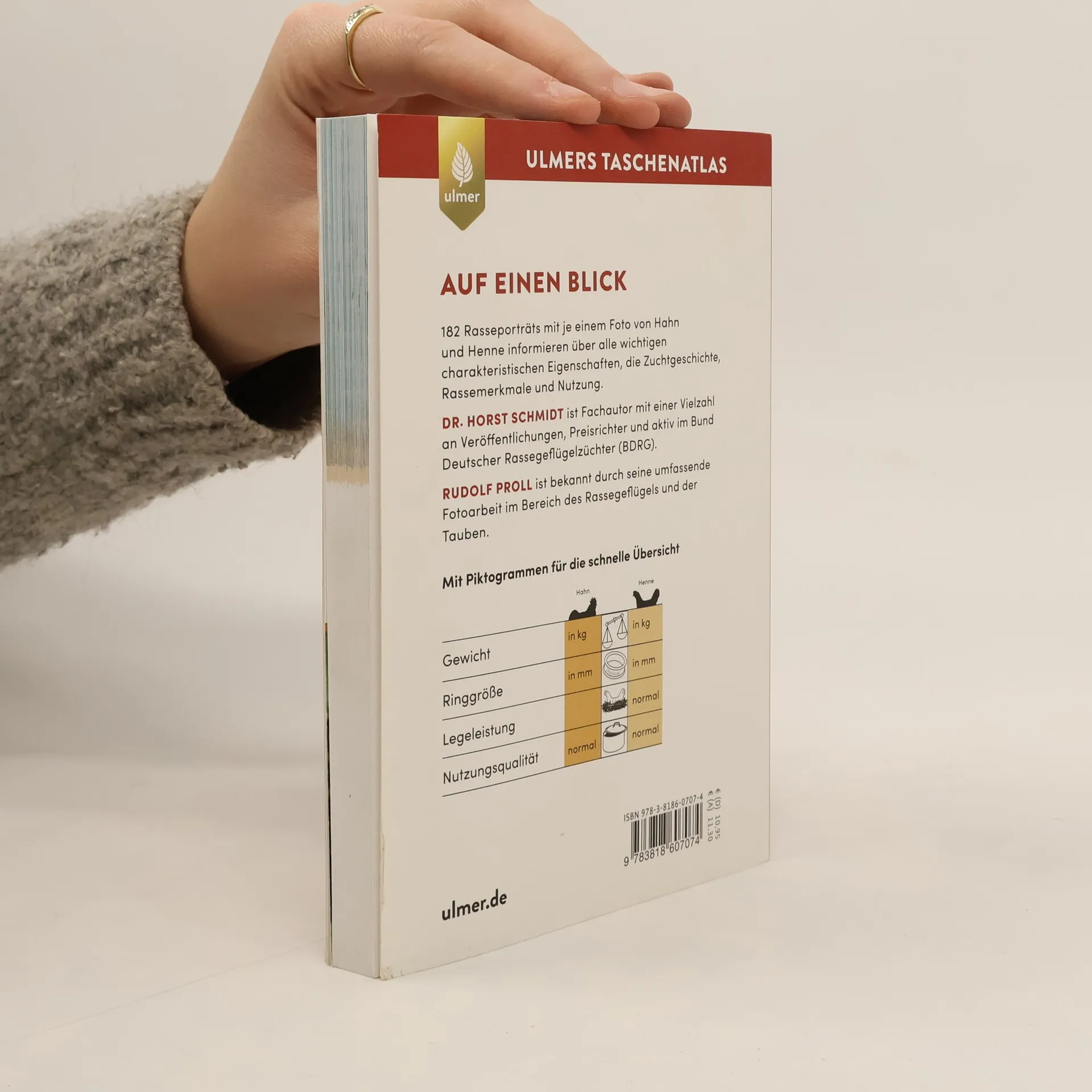 Unverzichtbar für Hobby-Hühnerhalter und solche, die es werden möchten, sowie für Kleintierzüchter und Ausstellungsbesucher: In diesem kompakten Nachschlagewerk werden 182 Rassen in 366 Farbfotos vorgestellt. Je ein Foto von Hahn und Henne zeigt beispielhaft standardgerechte Vertreter der Rasse. Über Zuchtgeschichte, Rassemerkmale und alle wichtigen charakteristischen Eigenschaften, Besonderheiten, Farbenschläge, Legeleistung und Nutzung der unterschiedlichen Hühner und Zwerghühner informiert das handliche Buch auf einen Blick.