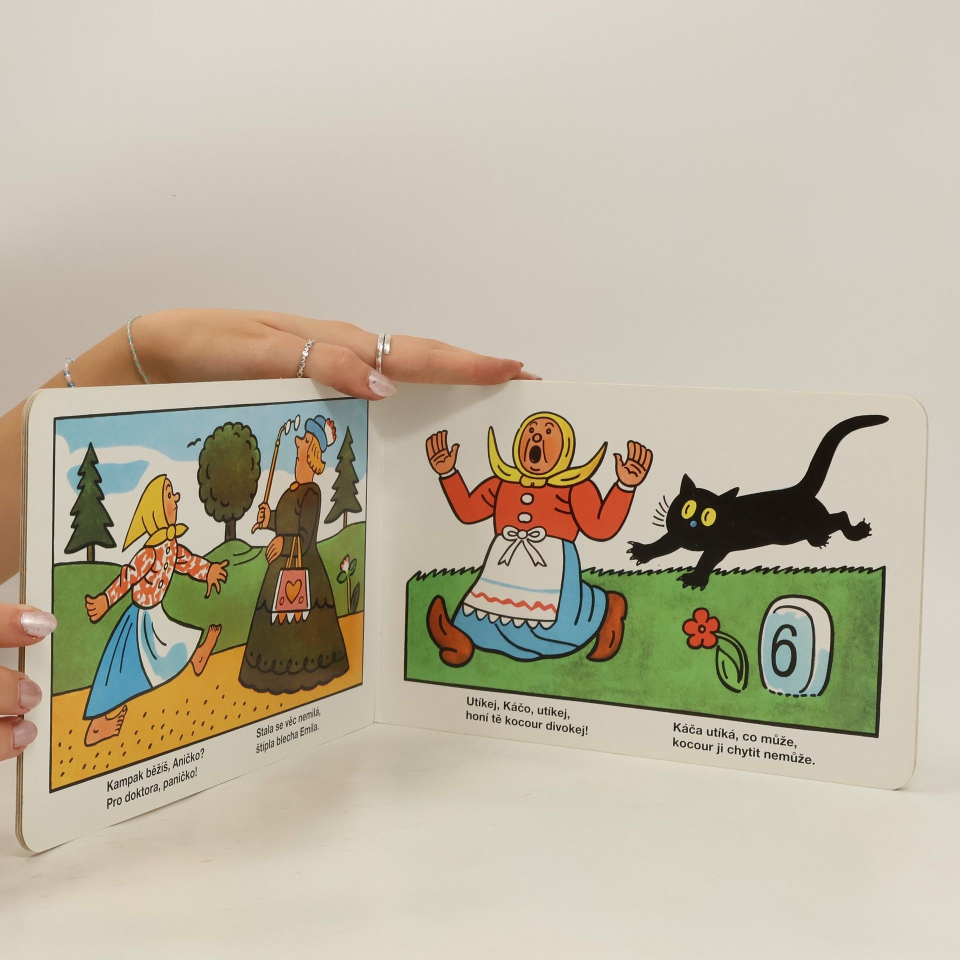 Klasické leporelo, které poprvé vyšlo před sedmdesáti lety (1941)! V nakladatelství Albatros nově a poprvé v roce 1968; později v pozměněném vydání pod názvem Utíkej, Káčo, utíkej! Veselé leporelo Josefa Lady s lidovými říkadly o koťatech, zajíčkovi, vodníkovi, zimě, houbách... je dnes českou klasikou i nakladatelským evergreenem.