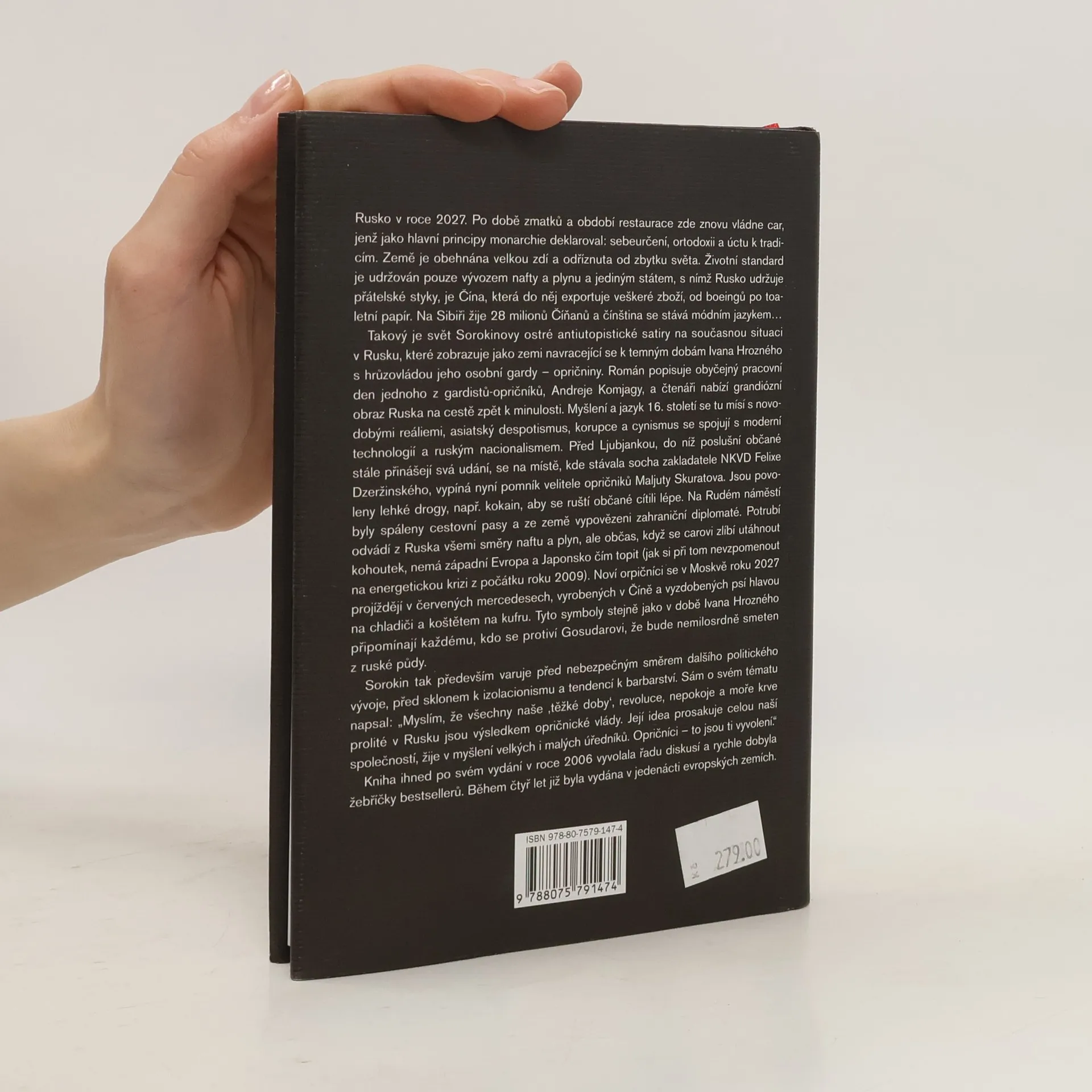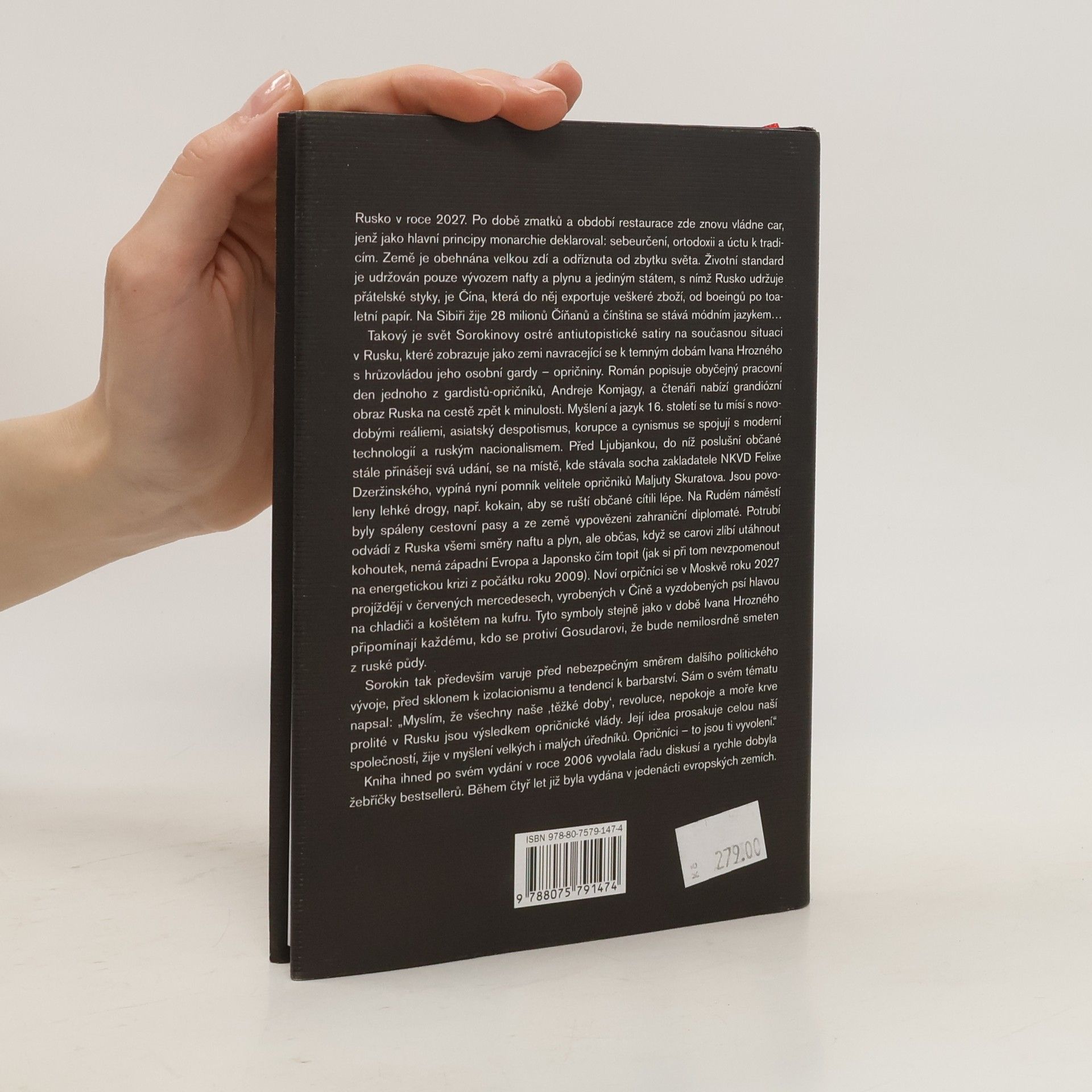 Kniha ihned po svém vydání vyvolala řadu diskusí a rychle dobyla žebříčky bestsellerů. Během čtyř let již byla vydána v jedenácti evropských zemích. Rusko v roce 2027. Po době zmatků a období restaurace zde znovu vládne car. Země je obehnána Velkou zdí a odříznuta od zbytku světa. Životní standard je udržován pouze vývozem nafty a plynu a jediným státem, s nímž Rusko udržuje přátelské styky, je Čína, která do něj exportuje veškeré zboží, od Boeingů po toaletní papír. Na Sibiři žije 28 miliónů Číňanů a čínština se stává módním jazykem… Takový je svět Sorokinovy ostré antiutopistické satiry, které zobrazuje jako zemi navracející se k temným dobám Ivana Hrozného s hrůzovládou jeho osobní gardy – opričniny. Román nabízí grandiosní obraz Ruska na cestě zpět k minulosti. Myšlení a jazyk 16. století se tu mísí s novodobými reáliemi, asiatský despotismus, korupce a cynismus se spojují s moderní technologií a ruským nacionalismem. Noví orpičnici se tu projíždějí v červených mercedesech, vyzdobených psí hlavou na chladiči a koštětem na kufru. Tyto symboly stejně jako v době Ivana Hrozného hrozí každému, kdo se protiví carově moci, že bude nemilosrdně smeten z ruské půdy. Sorokin tak především varuje před nebezpečným směrem dalšího politického vývoje, před sklonem k isolacionismu a tendencí k barbarství, která se mu zdá být částí ruské metafyziky.