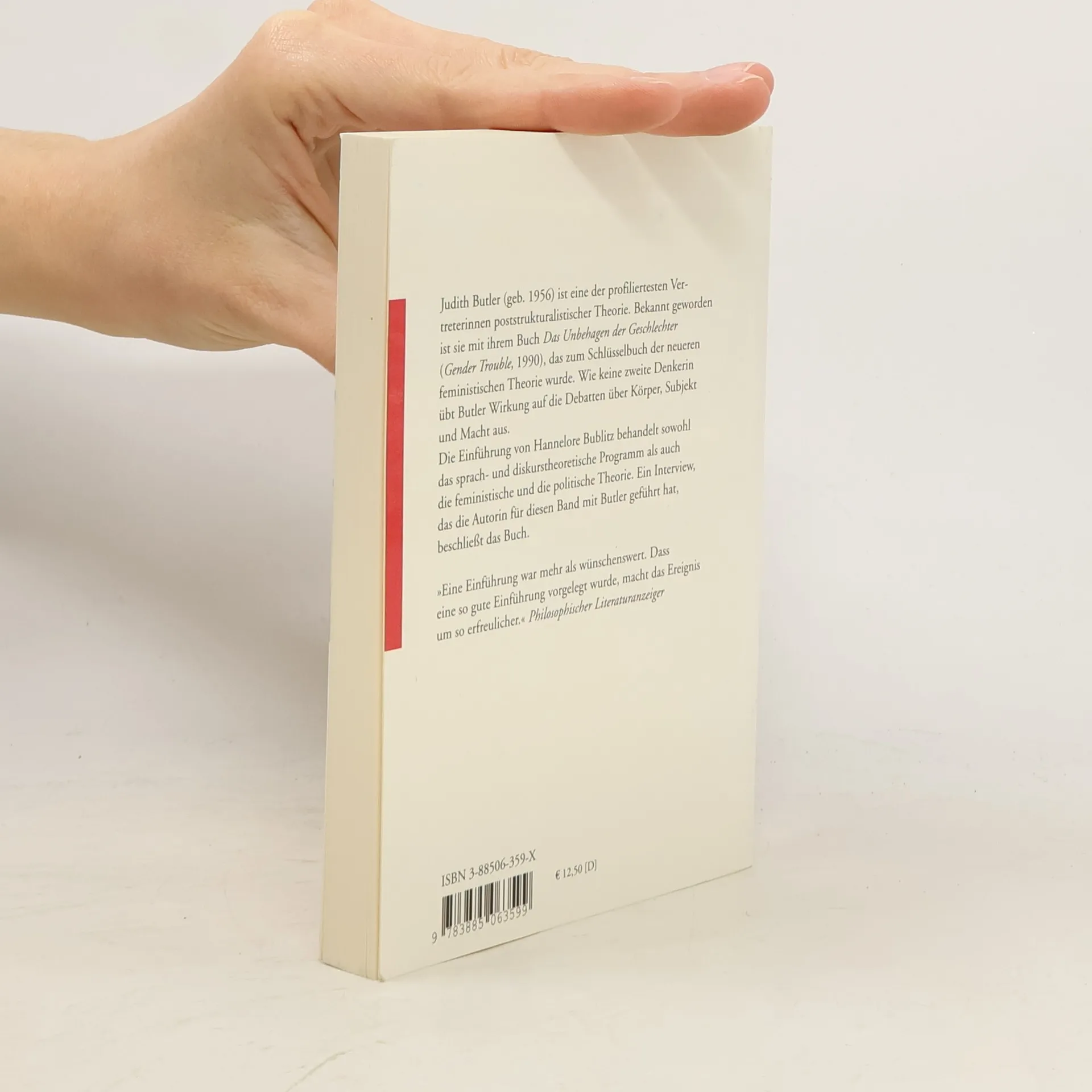 Judith Butler (geb. 1956) ist eine der profiliertesten Vertreterinnen poststrukturalistischer Theorie. Bekannt geworden ist sie mit ihrem Buch Das Unbehagen der Geschlechter, das zum Schlüsselbuch der neueren feministischen Theorie wurde. Wie keine zweite Denkerin übt Butler Wirkung auf die Debatten über Körper, Subjekt und Macht aus. Diese Einführung behandelt sowohl das sprach- und diskurstheoretische Programm als auch die feministische und die politische Theorie. Für die dritte, vollständig überarbeitete Auflage des Bandes wurden die neueren Schriften Butlers ebenso berücksichtigt wie die jüngeren politischen Einlassungen der Autorin.
