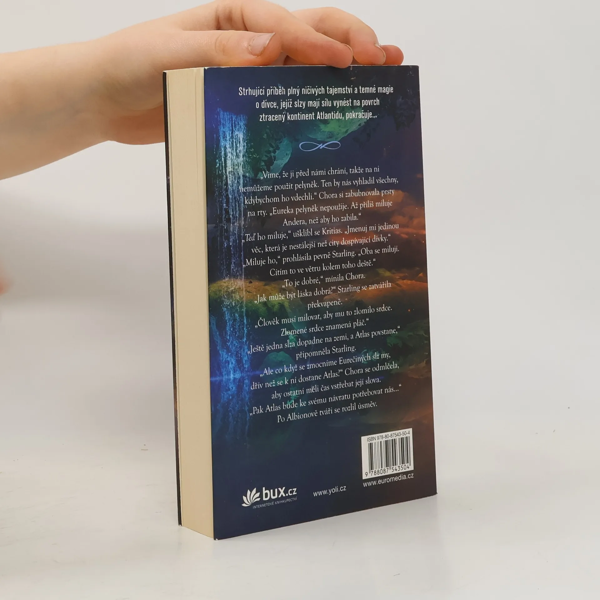 Strhující milostná sága plná ničivých tajemství a temné magie o dívce, jejíž slzy mají sílu vynést na povrch ztracený kontinent Atlantidu, pokračuje. Eurečiny slzy zaplavily zemi a nyní Atlantida roste a s ní i moc zlého vládce Atlase. Eureka je jediná, kdo ho může zastavit, ale nejprve se musí naučit, jak bojovat. Ku pomoci jsou jí naštěstí přátelé. Vydává se na cestu přes oceán s kamarádkou Cat, její rodinou, Anderem a rovněž oslňujícím, ale i tajemným Sadařem, který Eurece přislíbil, že jí pomůže najít Solona. Ten totiž jako jediný ví, jak porazit velkého Atlase. Eureka má šanci zachránit svět, ale co všechno bude muset obětovat? Nebude právě její láska k Anderovi zároveň největší překážkou? Druhý díl úspěšné série Slza od bestsellerové autorky série Andělé.