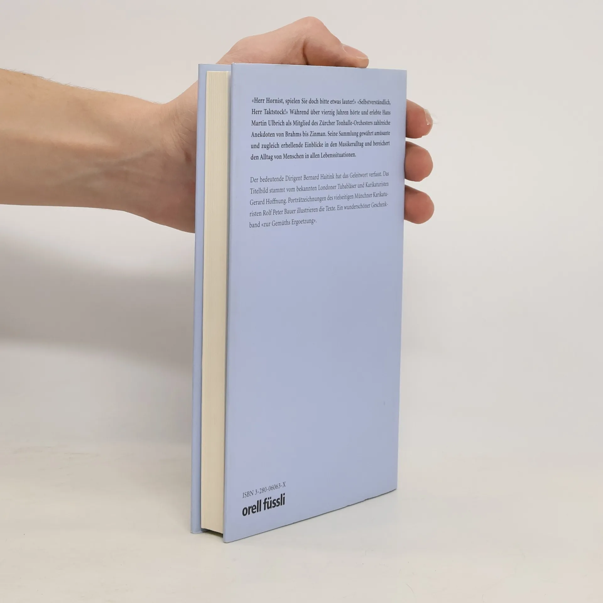 'Herr Hornist, spielen Sie doch bitte etwas lauter!' 'Selbstverständlich, Herr Taktstock!' Während über 40 Jahren hörte und erlebte Hans Martin Ulbrich als Mitglied des Zürcher Tonhalle-Orchesters zahlreiche Anekdoten von Brahms bis Zinman. Seine Sammlung gibt einen amüsanten und zugleich erhellenden Einblick in den Musikeralltag. Der Dirigent Bernard Haitink hat exklusiv ein Geleitwort verfasst. Das Titelbild stammt vom Londoner Tubabläser und Karikaturisten Gerard Hoffnung. Karikaturen von Rolf Peter Bauer illustrieren den Text. Herausgekommen ist ein schöner und origineller Geschenkband 'zur Gemueths Ergoetzung'.