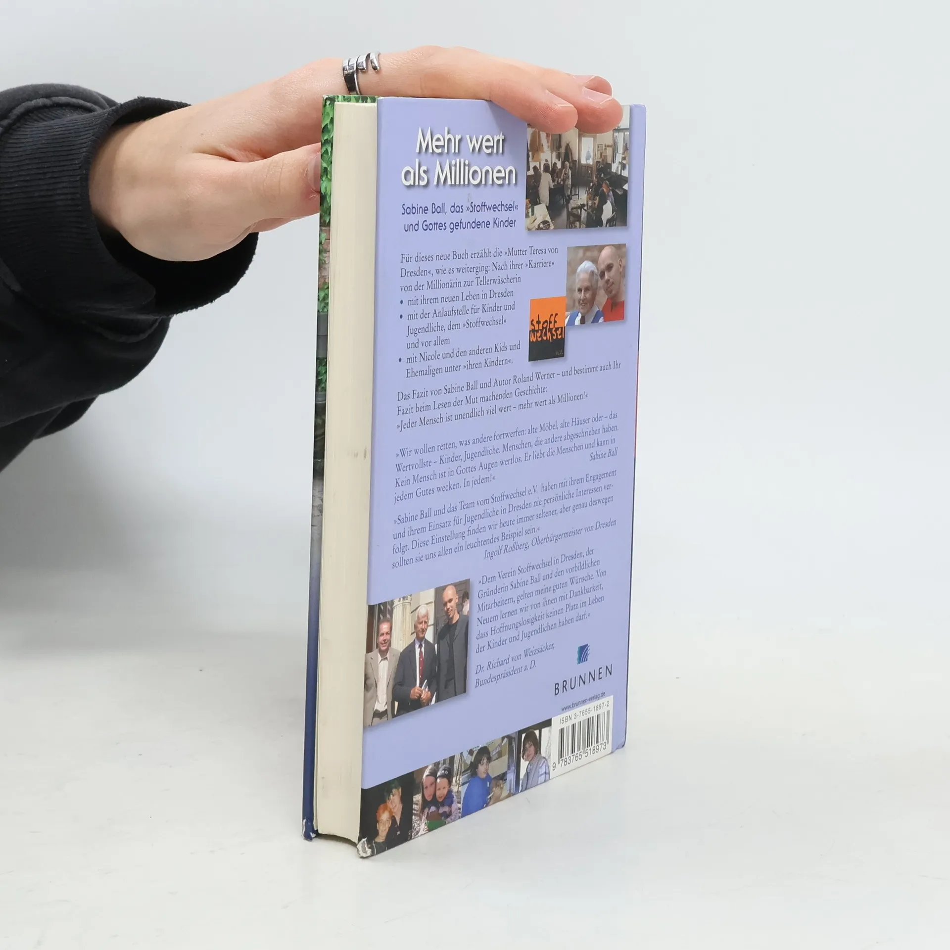 Sabine Ball erzählt in „Mehr wert als Millionen“, wie es weiterging: Nach ihrer „Karriere“ von der Millionärin zur Tellerwäscherin … mit ihrem neuen Leben in Dresden, … mit der Anlaufstelle für Kinder und Jugendliche „café stoffwechsel“, … und vor allem mit Mo, NN und all den anderen „Kindern der Mutter Teresa von Dresden“. Aufgezeichnet ist ihr Bericht von Roland Werner – der wie Sabine Ball einen Blick und ein Herz für die junge Generation hat. Und für Gott, der im Leben von jungen und alten Menschen ganz überraschend Geschichte schreiben kann!
