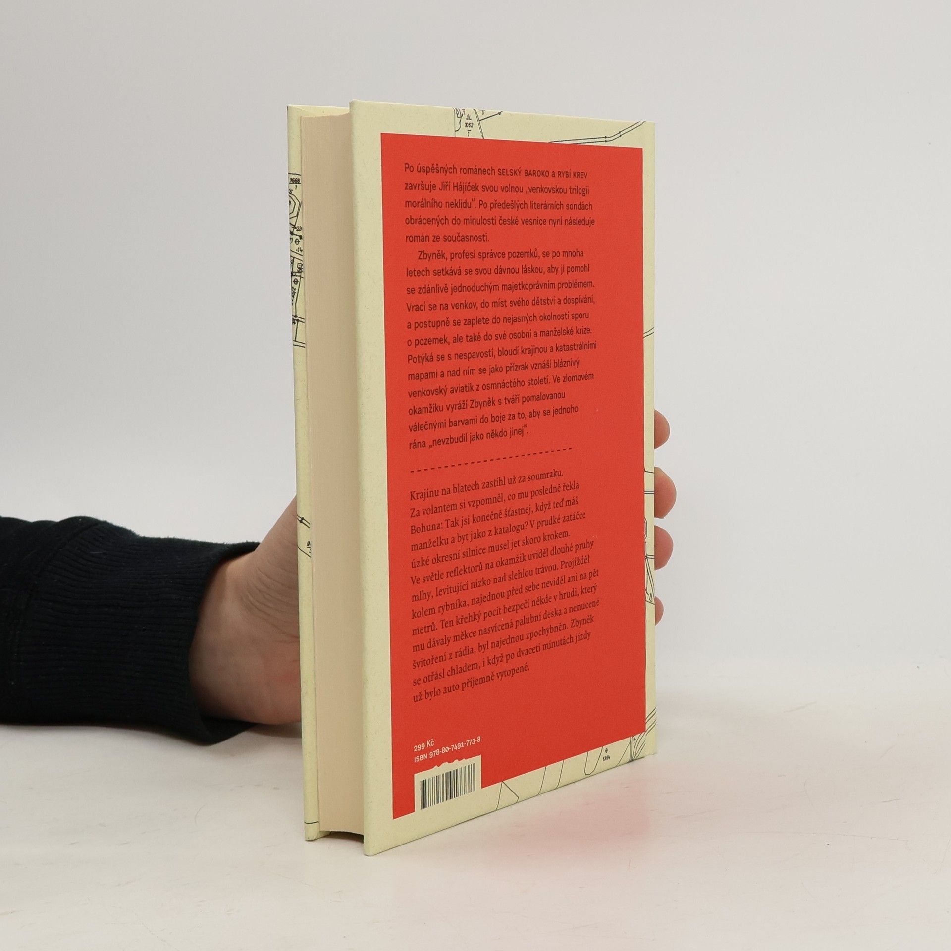 Po úspěšných románech Selský baroko a Rybí krev završuje Jiří Hájíček svou volnou „venkovskou trilogii morálního neklidu“. Předešlé literární sondy obrácené do minulosti české vesnice následuje nyní román ze současnosti. Opět silný příběh, v němž kromě lidí tentokrát hrají důležitou roli pozemky — zděděná pole a spory kolem jejich vlastnictví. Venkovská krajina jihočeských blat je vůbec v textu silně přítomna a kromě jedinečné atmosféry dodává příběhu i historický kontext a také nepřímo vstupuje do osudů hlavních postav. Zbyněk, profesí správce pozemků, se po mnoha letech setkává se svou dávnou láskou, aby jí pomohl se zdánlivě jednoduchým majetkoprávním problémem. Vrací se na venkov, na místa svého dětství a dospívání, a zamotává se do nejasných okolností pozemkového sporu, ale také do osobní a manželské krize. Potýká se s nespavostí, bloudí krajinou a katastrálními mapami a nad ním se jako přízrak vznáší bláznivý venkovský aviatik z osmnáctého století. Ve zlomovém okamžiku jde Zbyněk s tváří pomalovanou válečnými barvami do boje. Za to, co považuje za správné, za sny dětství a „aby se jednoho rána neprobudil jako někdo jiný“.