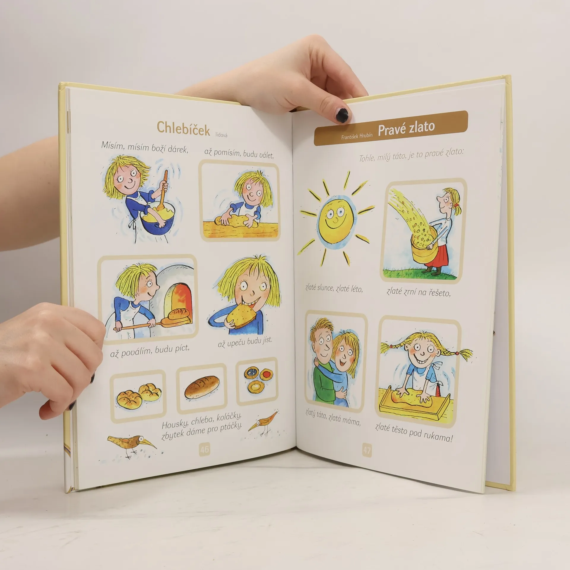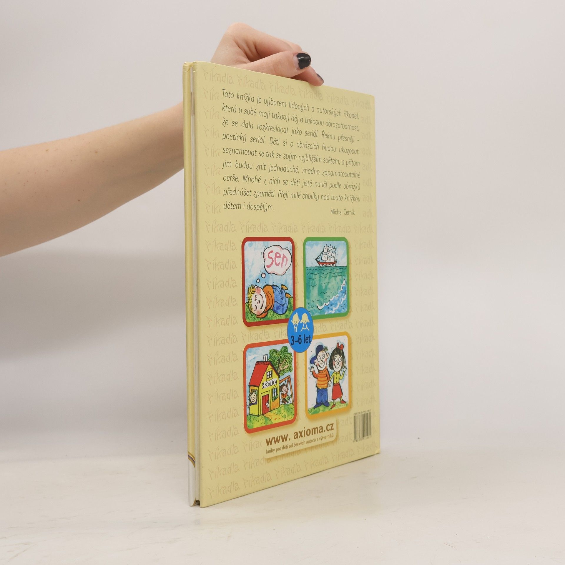 Tato knížka je výborem lidových a autorských říkadel (František Hrubín, Jan Čarek, Michal Černík, Jiří Žáček, Jan Vodňanský aj.), která v sobě mají takový děj a takovou obrazotvornost, že se každý verš dal rozkreslit do jednotlivých obrázků jako seriál nebo komiks. Děti si tak mohou v obrázcích ukazovat, seznamovat se se svým nejbližším světěm, a přitom jim budou znít jednoduché, snadno zapamatovatelné verše, které se pomocí obrázků snadno naučí nazpaměť.
