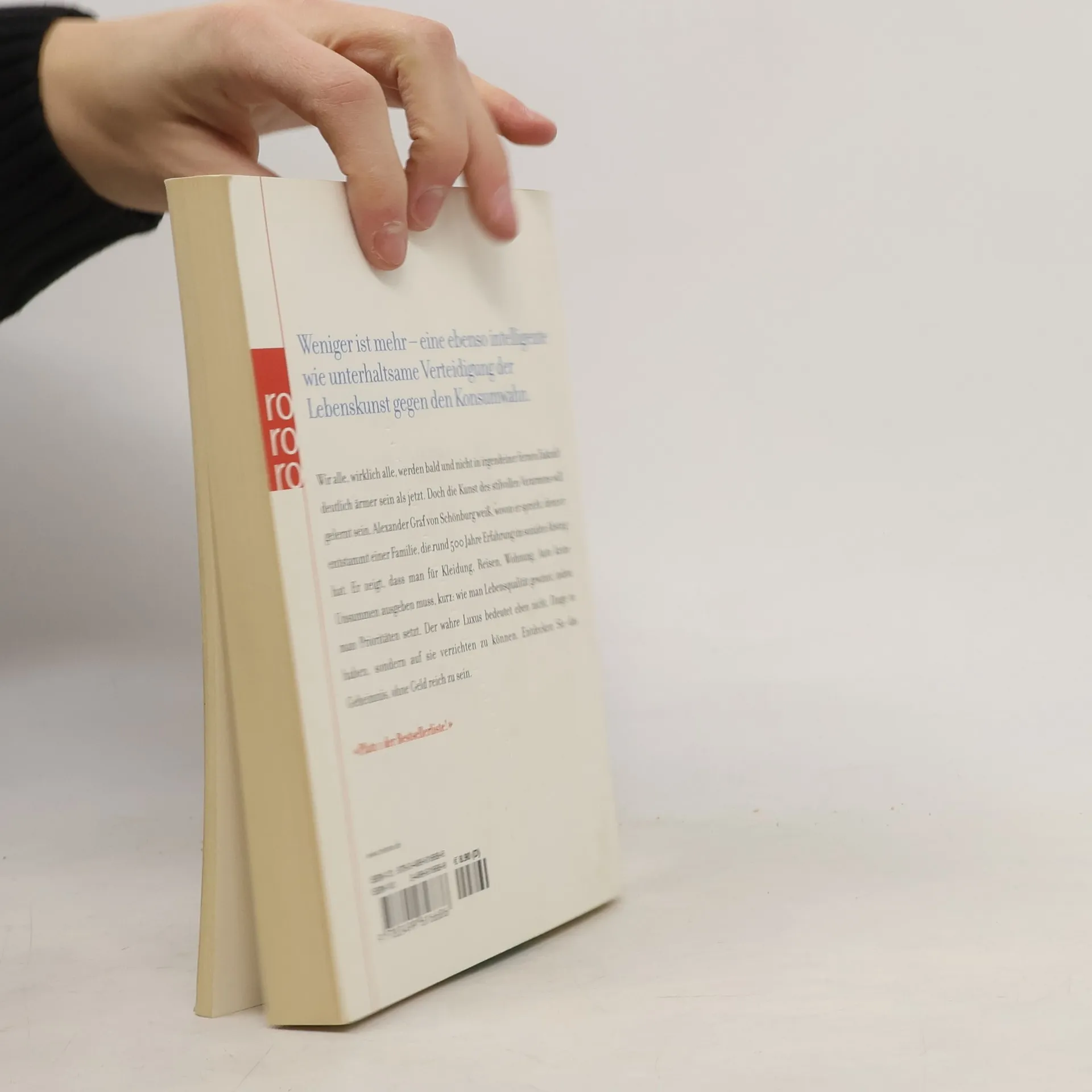 Weniger ist mehr - eine ebenso intelligente wie unterhaltsame Verteidigung der Lebenskunst gegen den Konsumwahn. Wir alle, wirklich alle, werden bald und nicht in irgendeiner fernen Zukunft deutlich ärmer sein als jetzt. Doch die Kunst des stilvollen Verarmens will gelernt sein. Alexander Graft von Schönburg weiß, wovon er spricht, denn er entstammt einer Familie, die rund 500 Jahre Erfahrung im sozialen Abstieg hat. Er zeigt, dass man für Kleidung, Reisen, Wohnung, Auto keine Unsummen ausgeben muss, kurz: wie man Lebensqualität gewinnt, indem man Prioritäten setzt. Der wahre Luxus bedeutet eben nciht, Dinge zu haben, sondern auf sie verzichten zu können. Entdecken Sie das Geheimnis, ohne Geld reich zu sein.