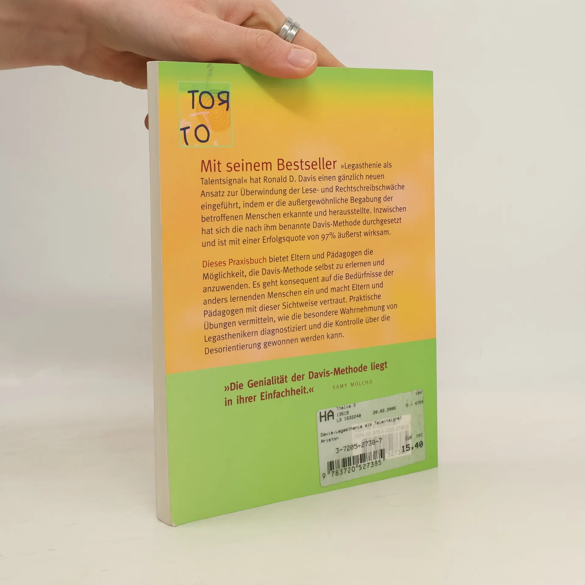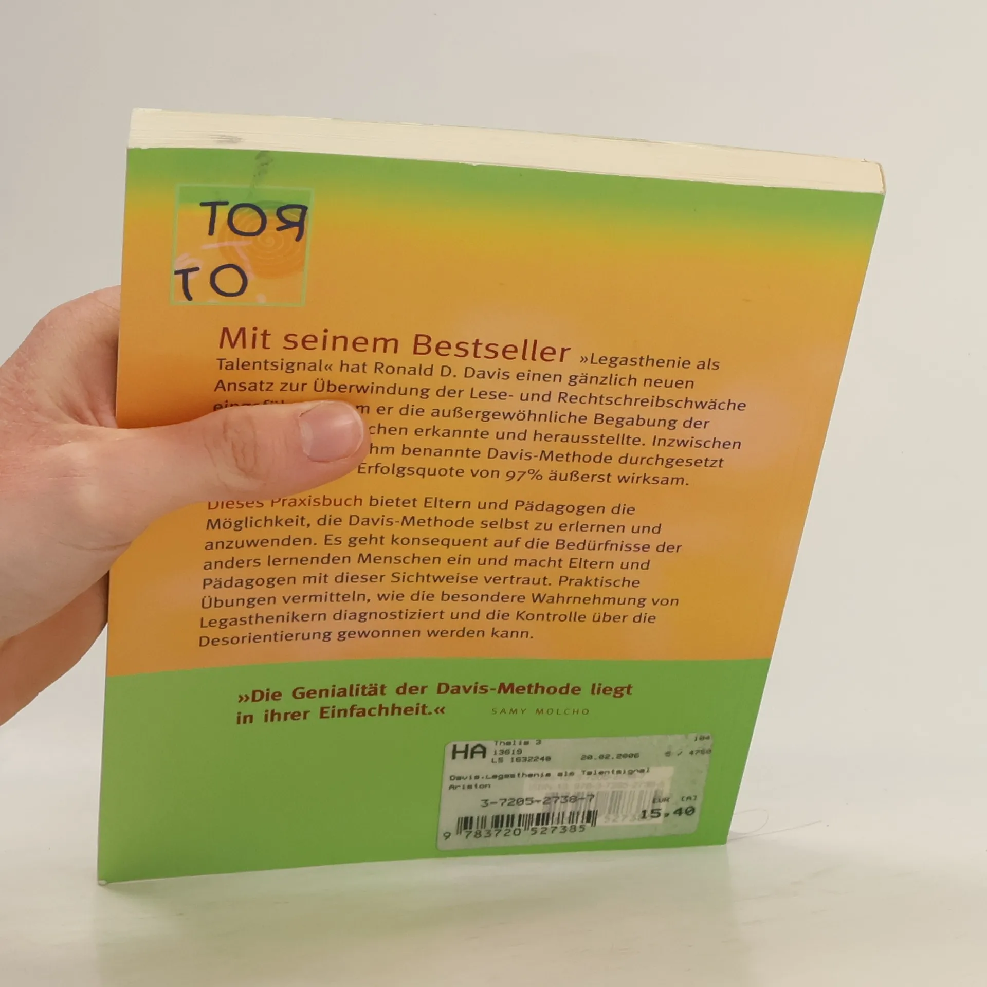 Mit seinem Bestseller Legasthenie als Talentsignal hat Ronald D. Davis einen gänzlich neuen Ansatz zur Überwindung der Lese- und Rechtschreibschwäche eingeführt, indem er die außergewöhnliche Begabung der betroffenen Menschen erkannte und herausstellte. Inzwischen hat sich die nach ihm benannte Davis-Methode durchgesetzt und ist mit einer Erfolgsquote von 97% enorm erfolgreich. Dieses Praxisbuch bietet Eltern und Pädagogen die Möglichkeit, die Davis-Methode selbst zu erlernen und anzuwenden. Es geht konsequent auf die Bedürfnisse der anders lernenden Menschen ein und macht Eltern und Pädagogen mit dieser Sichtweise vertraut.
